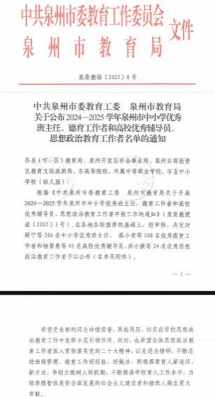 近日,泉州市教育局公布《2024-2025学年中小学优秀班主任、先进德育工作者和高校优秀辅导员、优秀思想政治教育工作者名单》,我院辅导员侯丽欣获评“泉州市高校优秀辅导员”。