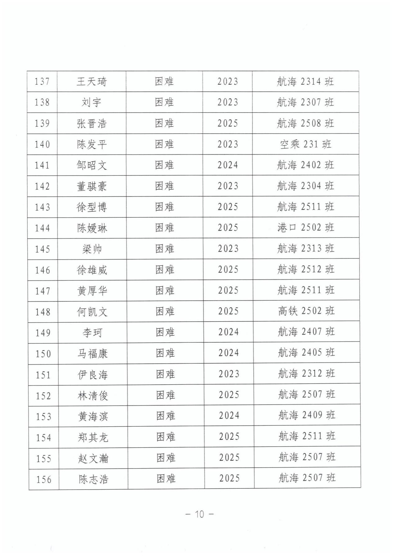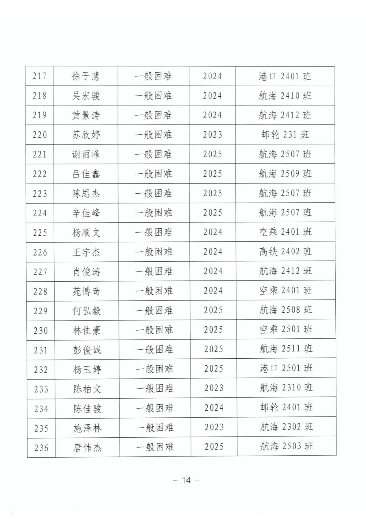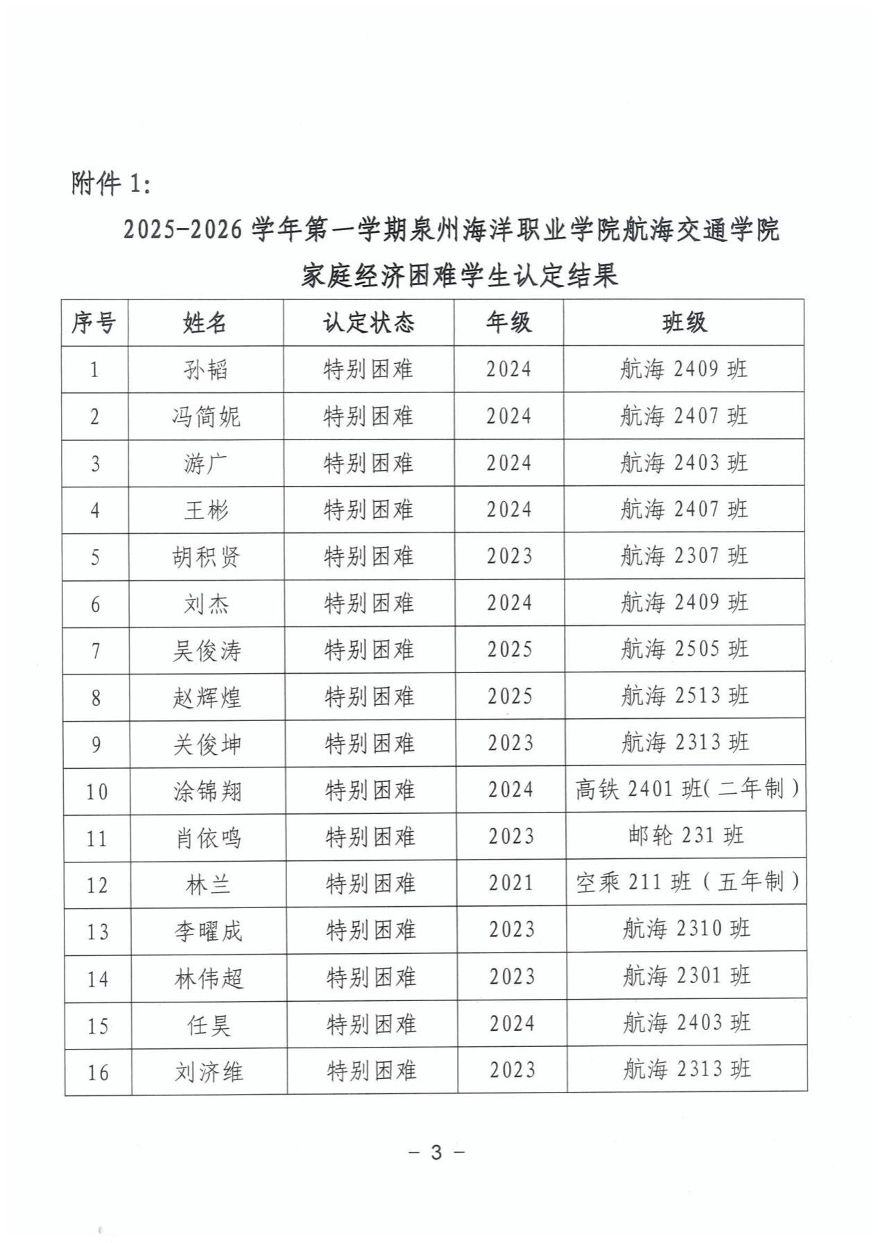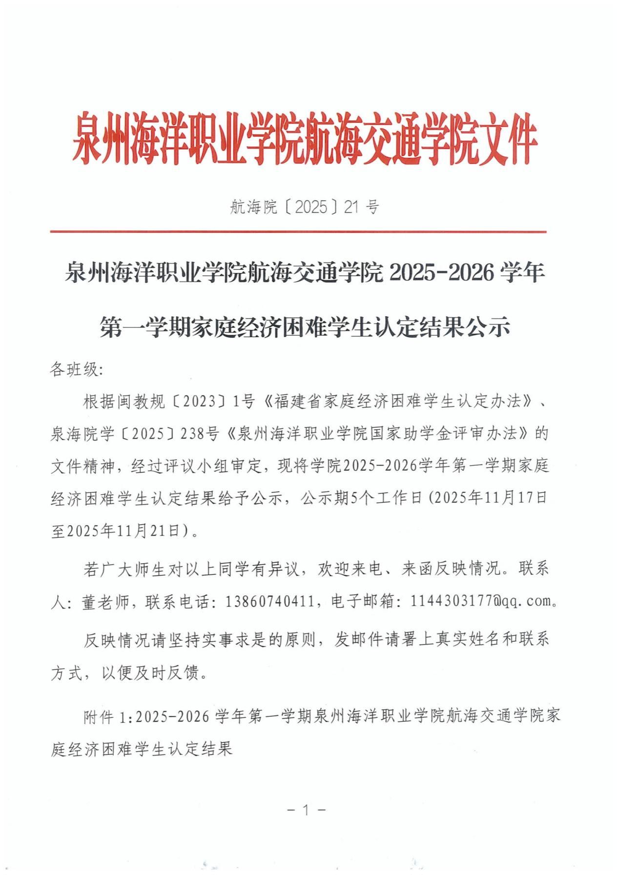 泉州海洋职业学院航海交通学院2025-2026学年第一学期家庭经济困难学生认定结果公示
