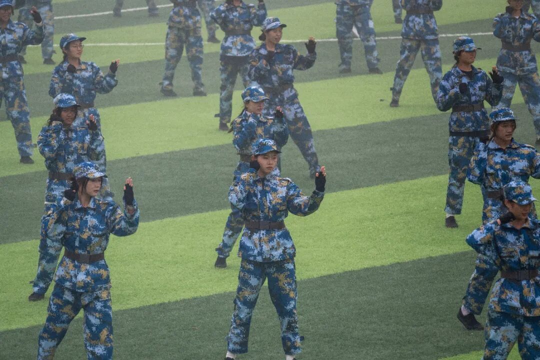 新生们化身"热血尖兵",手持训练枪展开刺杀操表演。"杀!杀!杀!"的呐喊声震耳欲聋,突刺、防刺、转身等动作干净利落、协调一致。汗水浸湿了迷彩服,却浇不灭他们眼中的锐气,每一个动作都凝聚着刻苦训练的汗水,展现了泉海学子不畏艰难的铁血豪情。