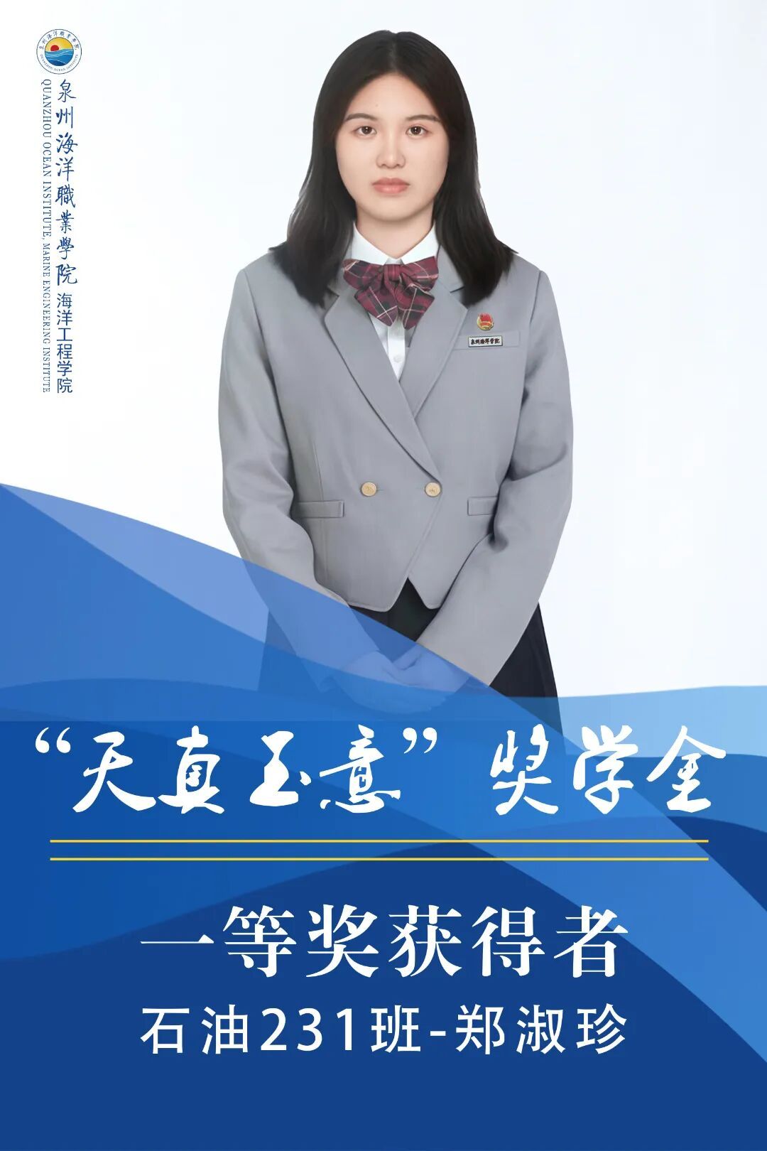 郑淑珍,女,中共预备党员,就读于泉州海洋职业学院海洋工程学院23石油化工技术专业。上学年综测、智育均排专业第2,获得2025年福建省现代化工HSE技能省赛“优秀奖”,2025年泉州海洋职业学院“三好学生”,2025年泉州海洋职业学院“二星级志愿者”,2024年泉州海洋职业学院党校第二十七期培训“优秀学员”。