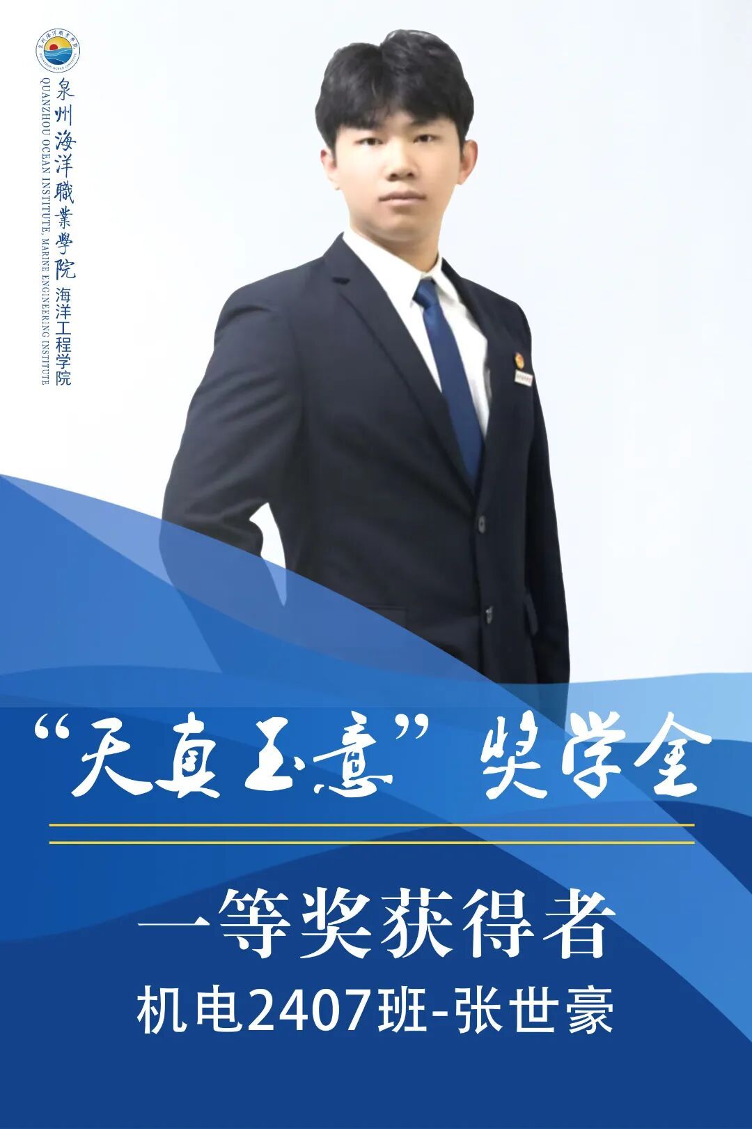 张世豪,男,共青团员,就读于泉州海洋职业学院海洋工程学院24机电一体化技术专业。上学年综测、智育均排专业第1,获得2024年泉州海洋职业学院军训“优秀标兵”,2025年福建省第十五届全国大学生电子商务“创新创业及创意”大赛省赛一等奖、校赛一等奖,获得2025年中国国际大学生创新大赛(2025)校赛一等奖。