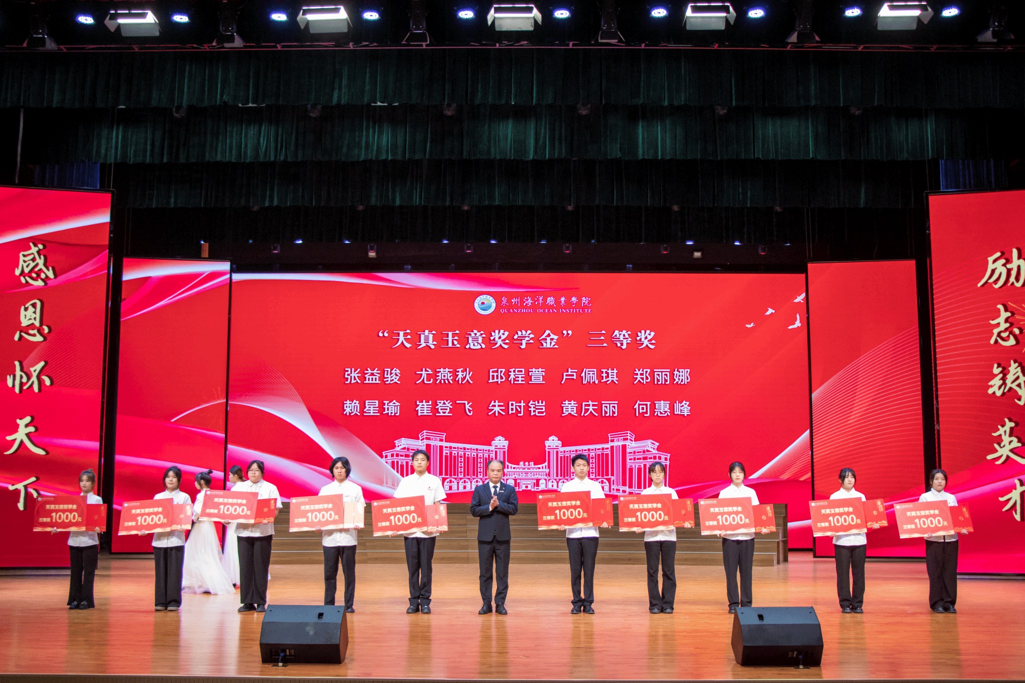 仪式现场,校党委副书记、副校长李明灿宣读了表彰文件。本次共颁发“天真玉意奖学金”一等奖20名、二等奖30名、三等奖50名。获奖学生分批上台领取荣誉证书,现场掌声不断。