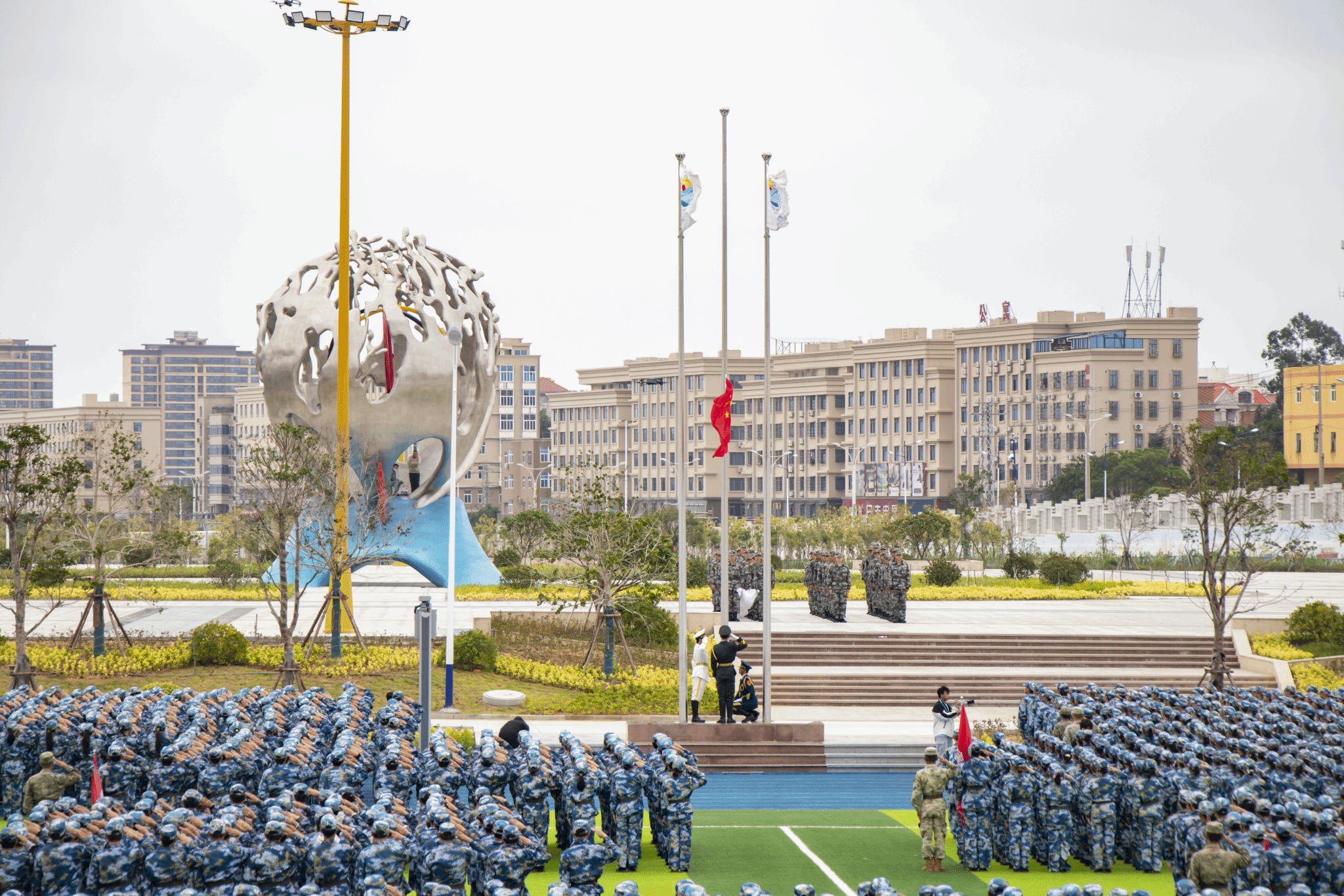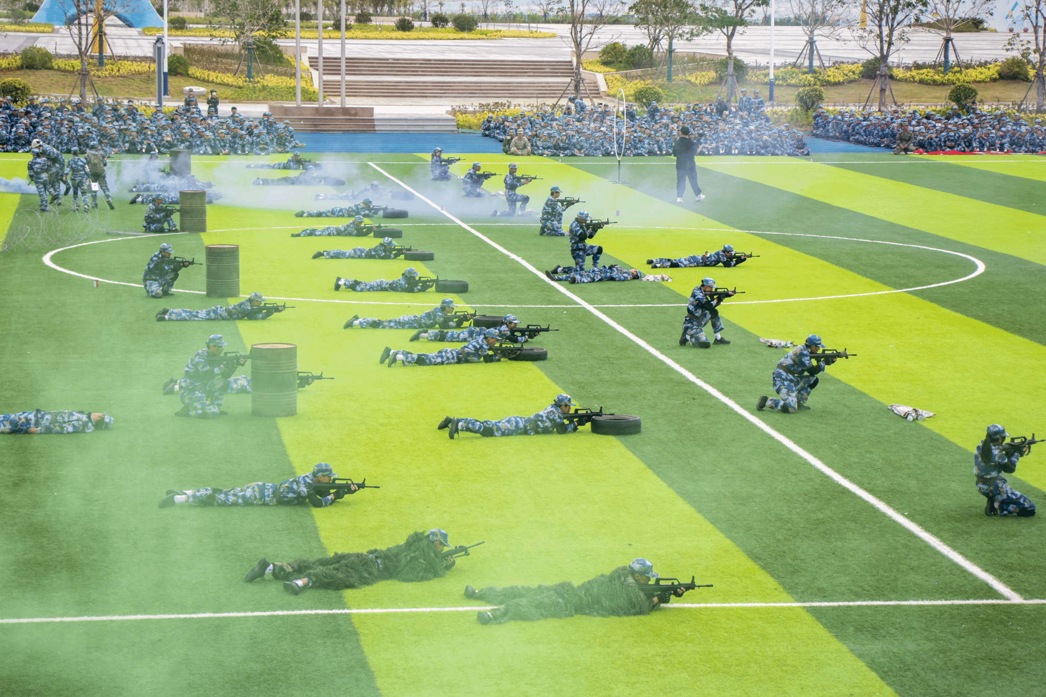 分列式后,精彩的军事科目汇报表演将现场气氛推向高潮。由各学院新生组成的特色方阵先后进行了军体拳、刺杀操、格斗术、战术演练以及富有学校海洋特色的数字方阵、旗语操等科目演示。