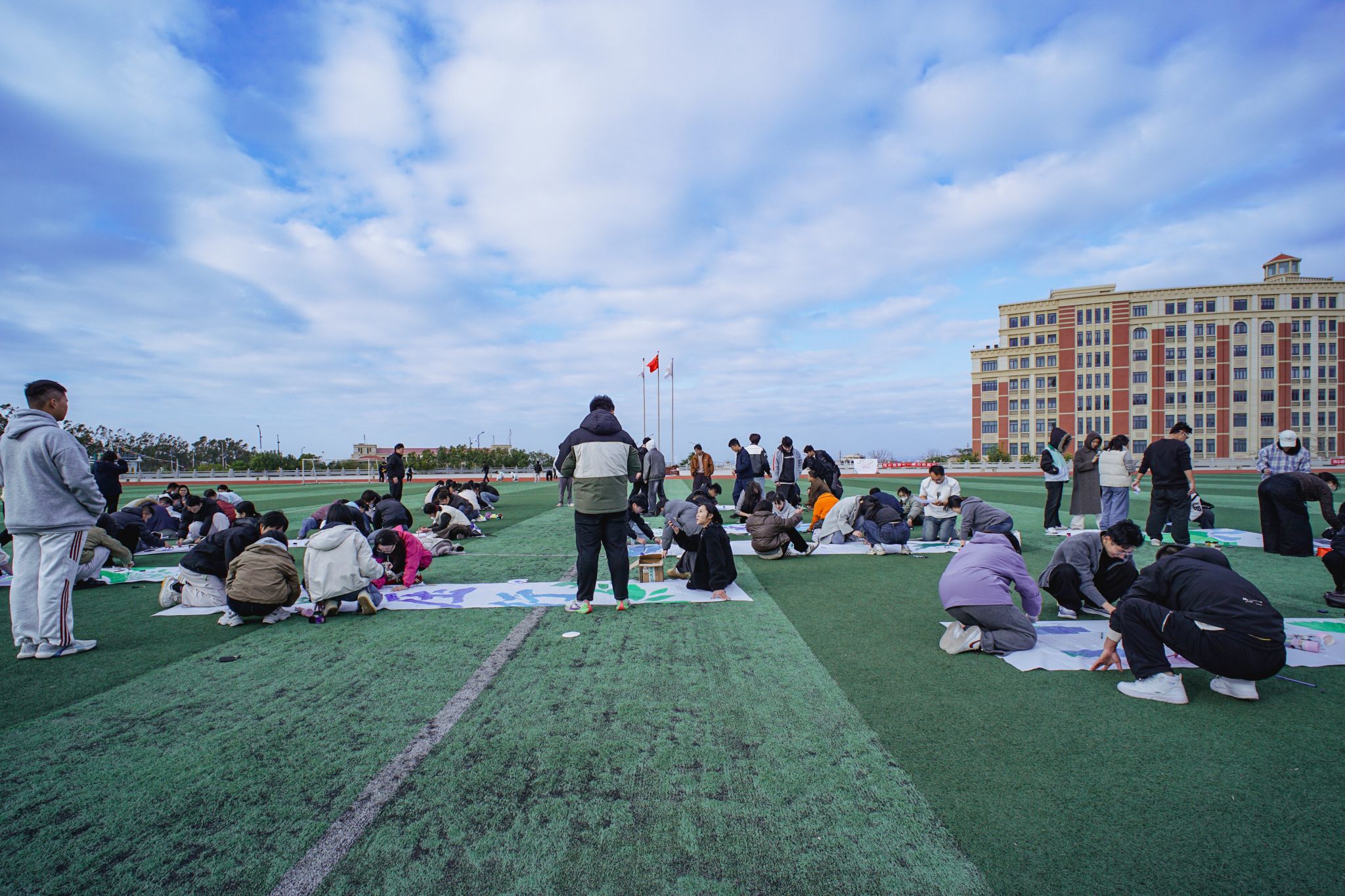 在备受期待的“纳斯卡巨画”集体创作环节,校党委副书记、副校长李明灿亲临现场,与老师们并肩交流、温暖互动。各组辅导员俯身勾线、挥洒色彩,最后共同拼接出一幅承载团队愿景的“同心蓝图”——这不仅是色彩与创意的融合,更是情感与共识的交汇,为这段午后时光留下了凝心共行的温暖印记。