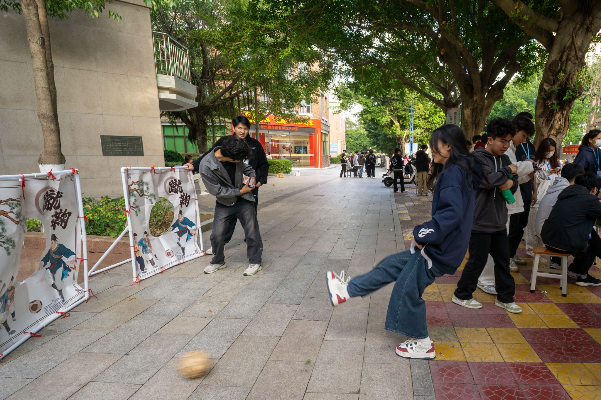 毽子翻飞、气球声响、蹴鞠入门——活力运动区的热情始终高涨。同学们在协作与竞赛中展现朝气,用跃动的身影为这个午后注入了满满的青春能量。尤其在“双足并进·球破天惊”环节中,大家在“踩别人的、护自己的”的博弈中奋勇争先,气球破裂的声响与现场的惊呼、欢笑交织在一起,热闹非凡。
