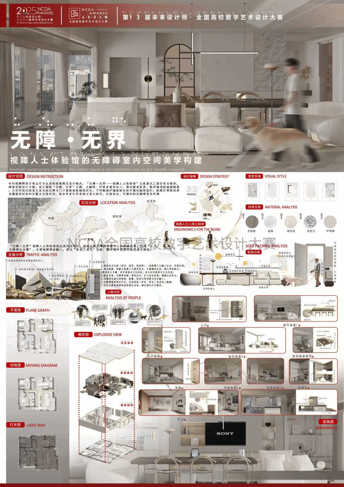 无障·无界-视障人士体验馆”——聚焦视障群体日常出行与生活体验难题及设计缺失问题,以家装式工装空间为载体,探索适配视障人士的无障碍设计方案。该项目围绕“无障、无界”主题展开,“障”指视障人士面临的物理障碍与不便,“无障”旨在消除这些障碍,打造友好通行的空间;“界”代表视障与明眼人群体在空间使用和交流上的界限,“无界”则是突破传统室内设计局限,融合创新科技与人文关怀,构建超越常规的无障碍居住空间范式。通过整合触觉、听觉等多感官设计强化对视障人士的指引。采用热感灯带联动语音播报实时告知方位 ,结合声音引导系统与盲文标识,全方位打造安全、可感知的无障碍居住环境。该设计核心是以科技载人文,以适能护尊严,让无障碍融入人文关怀,让自主生活回归生命本真,兼具人文温度与社会价值。