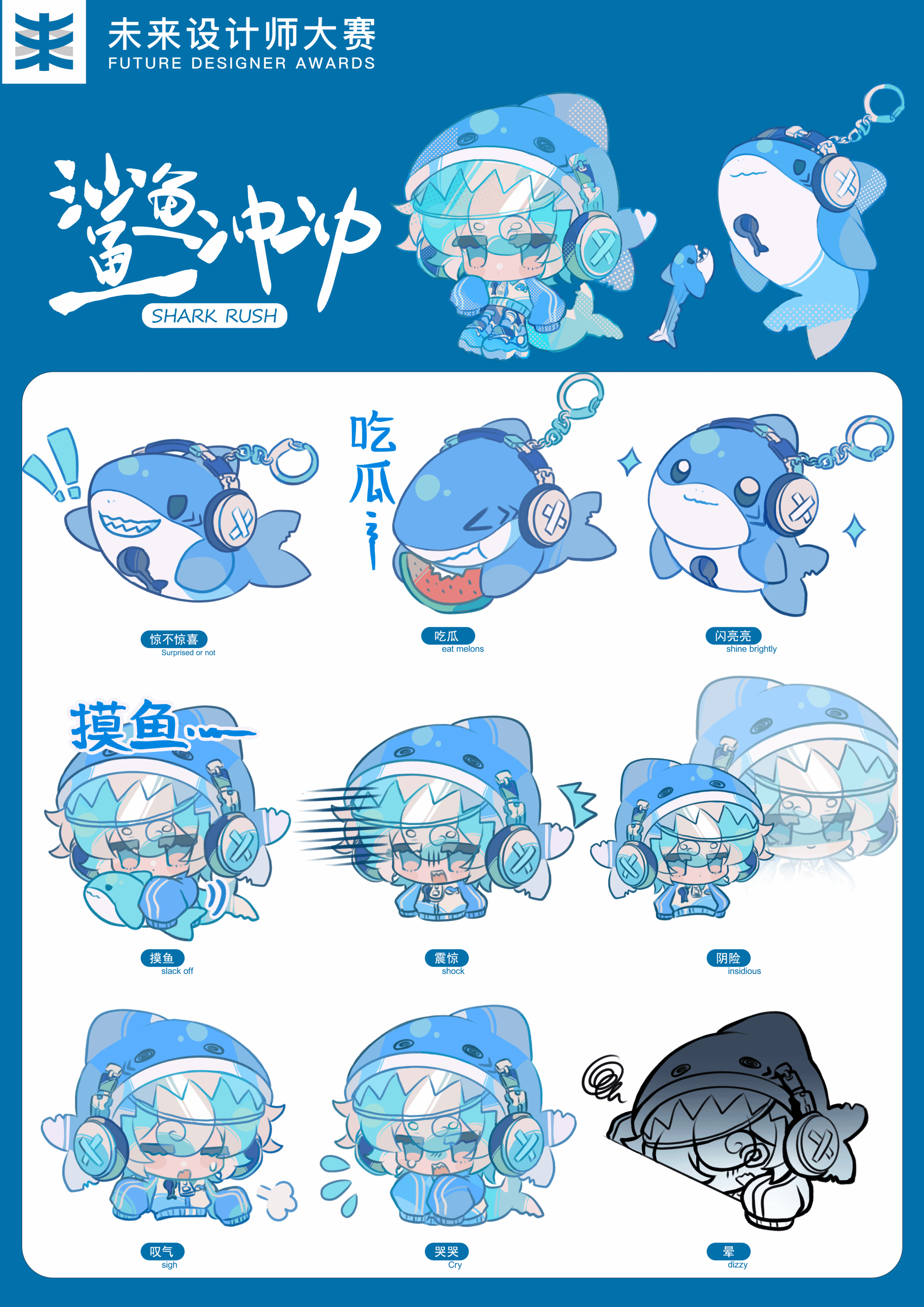 《鲨鱼冲冲》将海洋生物转化为一个当代文化符号。通过将鲨鱼设计成戴透明头盔、挂耳机的可爱拟人形象,搭配纯萌的鲨鱼本体挂件,用 “开心摸鱼”“快乐吃瓜”“晕头转向” 等生活化状态,对应打工人的日常情绪,既保留了海洋生物的清爽蓝调质感,又用夸张的表情动作让情绪更有共鸣感。使用代表福建海洋渔文化的蓝色,拉近民族文化的距离。
