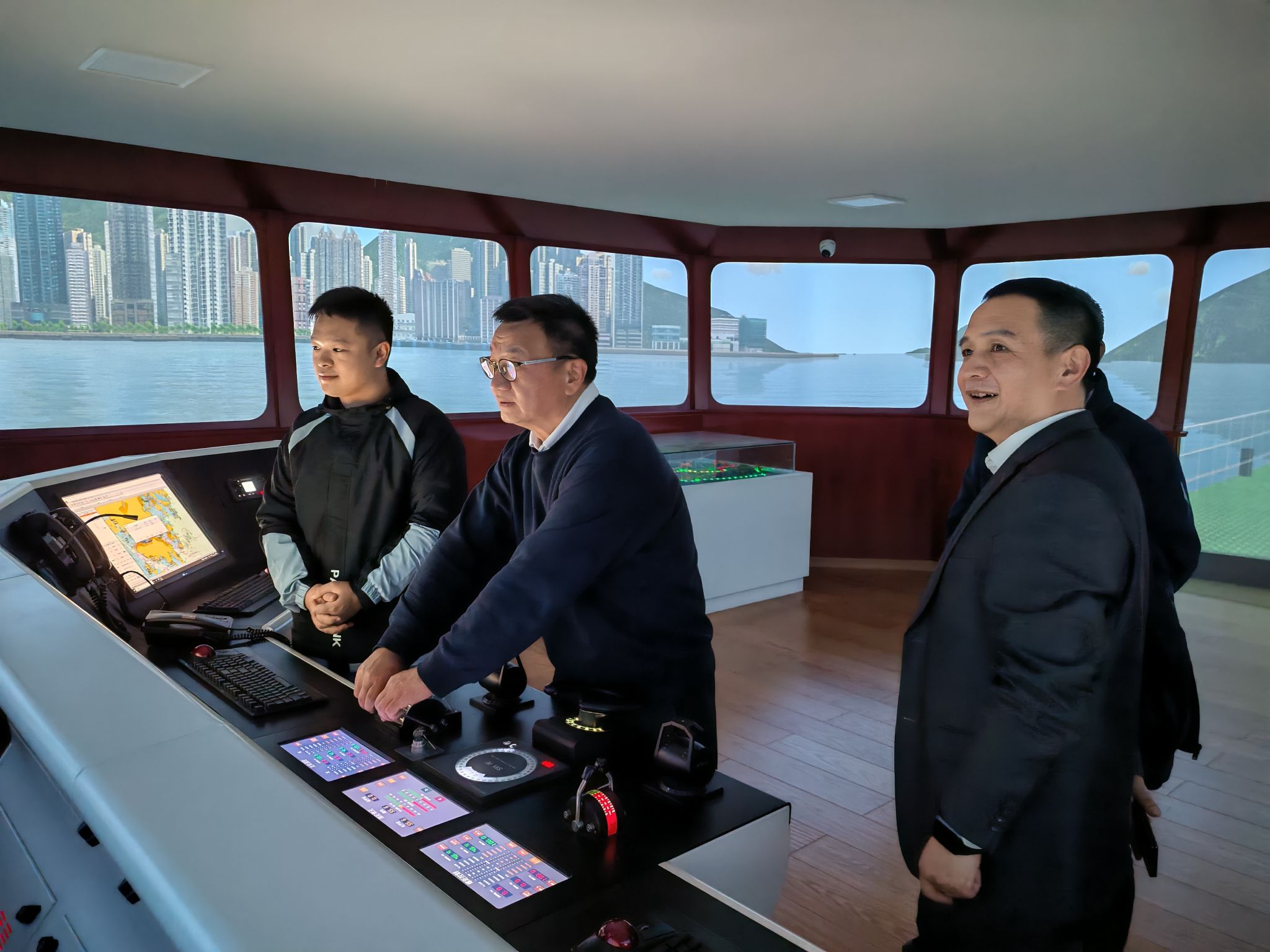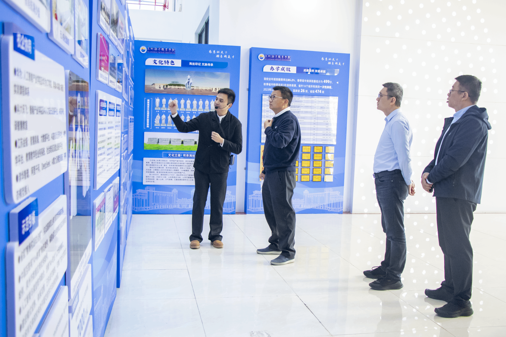胡建波董事长一行实地考察了我校“闽南海洋文化园”室外教育基地、世界特种船舶展示厅、“育航号”实训船及国际学术交流中心等特色场馆。这些场馆集中展现了我校在海洋文化传承、专业实训条件、党建育人及社会服务等方面的办学成果与鲜明特色,获得了考察团一行的积极评价。