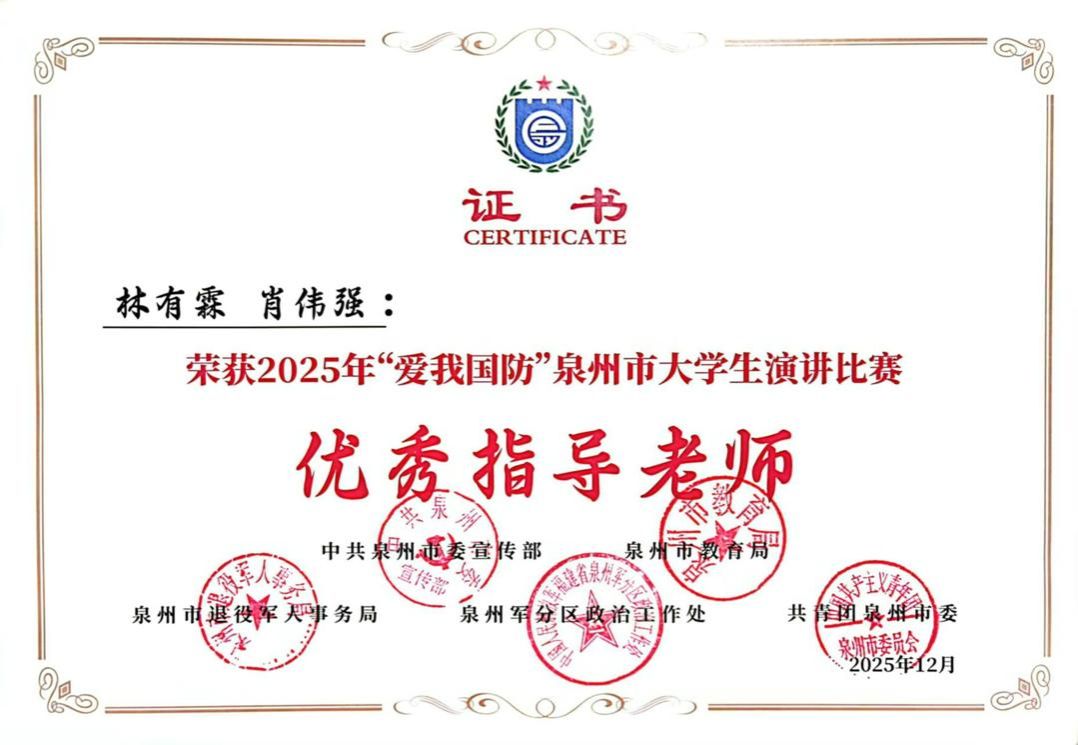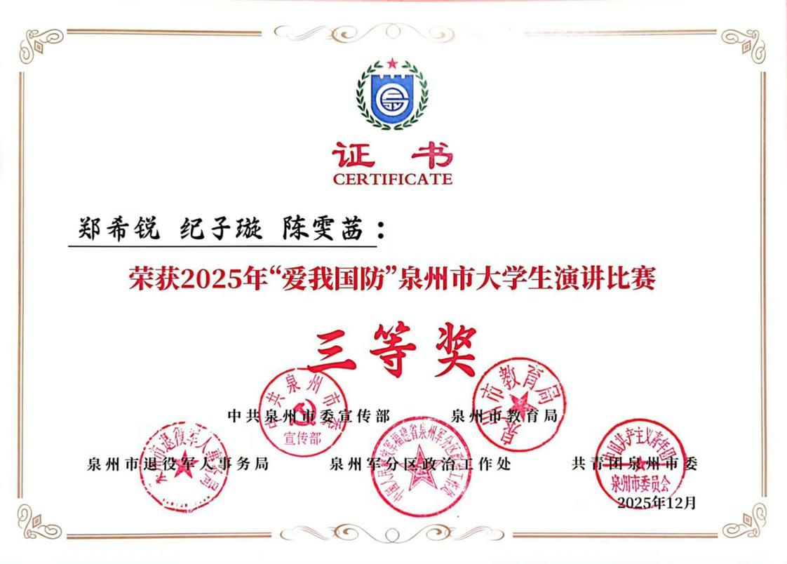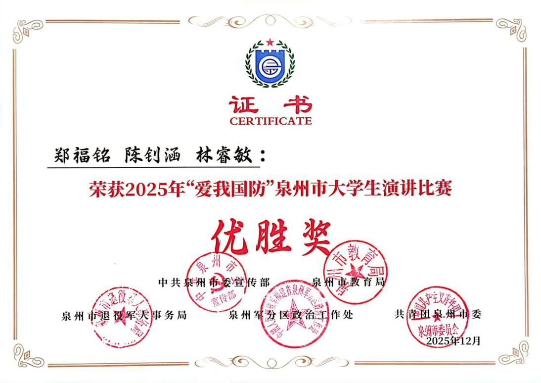 (新闻中心讯 校团委供稿 党委宣传部报道)2025年“爱我国防”泉州市大学生演讲比赛于日前传来佳讯,我校参加决赛的10名师生全部获奖,表现突出。