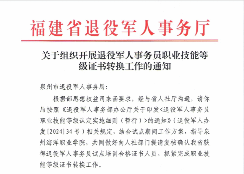 (新闻中心讯 退役军人教育学院供稿 党委宣传部报道)2月4日,石狮市退役军人服务中心内,一项由我校深度参与的重要成果正式落地——在基层服务近八年的林佑雄郑重接过编号“0001”的全国首张退役军人事务员职业技能等级证书,成为首位获得人力资源社会保障部、退役军人事务部“双认证”的退役军人事务员。这不仅是他个人职业生涯的新起点,更标志着“退役军人事务员”这一职业在全国范围内正式迈入专业化、标准化发展的新轨道。