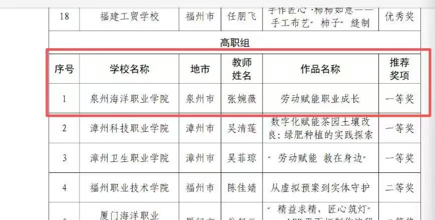 (新闻中心讯 通识教育学院供稿 党委宣传部报道)近日,福建省教育厅组织的全省劳动教育优秀课例展示暨晒课活动落幕,我校通识教育学院张婉薇老师的“劳动赋能职业成长”课例脱颖而出,荣获高职组一等奖第一名。