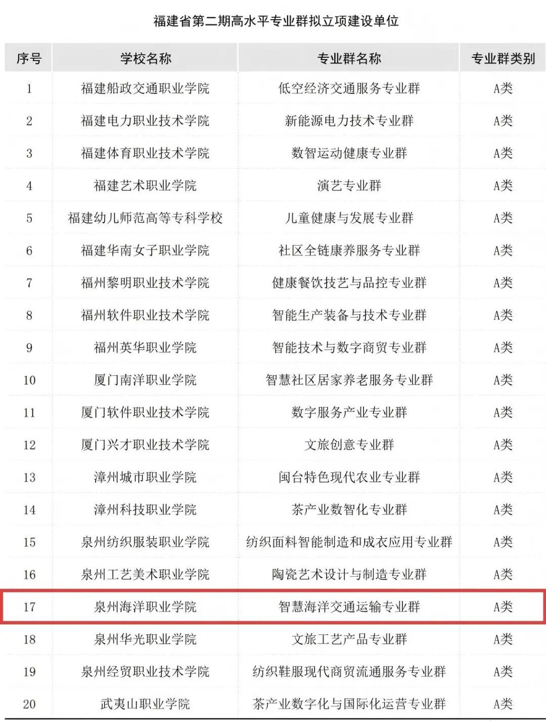 (新闻中心讯 教务处供稿 党委宣传部报道)近日,福建省教育厅、福建省财政厅联合发布《关于公布福建省第二期高水平高职学校和专业建设计划立项建设学校名单的通知》,我校“智慧海洋交通运输专业群”成功入选福建省A类高水平专业群,成为福建省重点支持建设的高水平专业群之一。