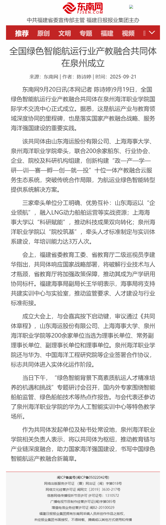 【东南网】全国绿色智能航运行业产教融合共同体在泉州成立