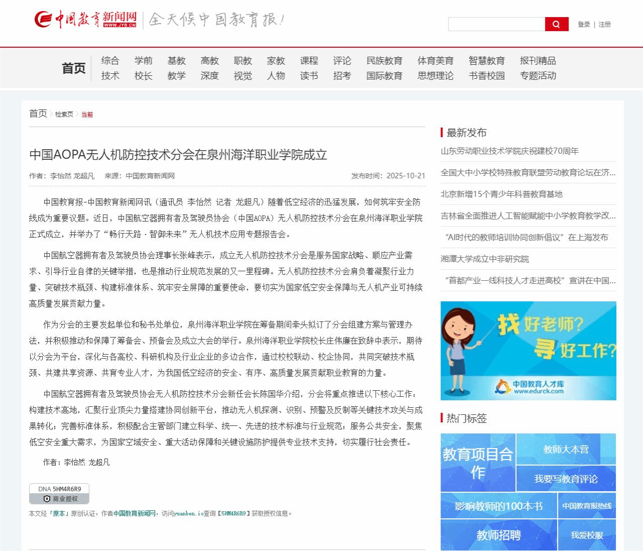 【中国教育新闻网】中国AOPA无人机防控技术分会在泉州海洋职业学院成立
