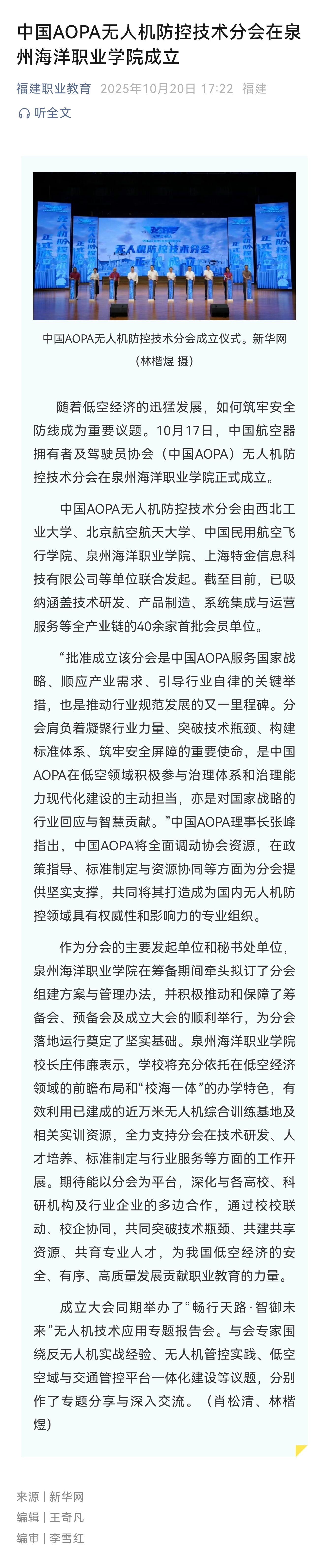 【福建职业教育】中国AOPA无人机防控技术分会在泉州海洋职业学院成立