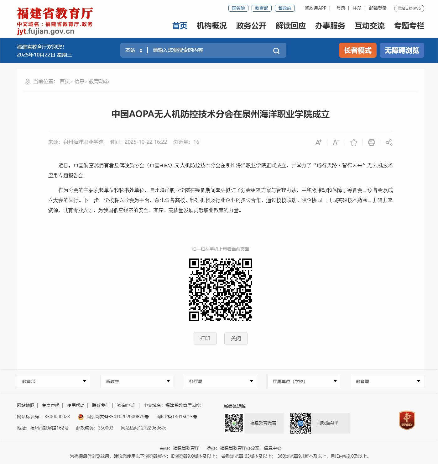 【中国教育新闻网】中国AOPA无人机防控技术分会在泉州海洋职业学院成立