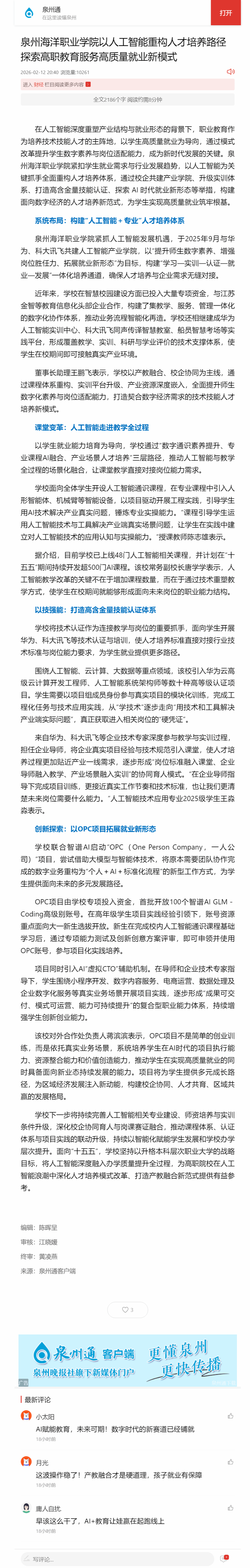 【泉州晚报——泉州通客户端】泉州海洋职业学院以人工智能重构人才培养路径 探索高职教育服务高质量就业新模式