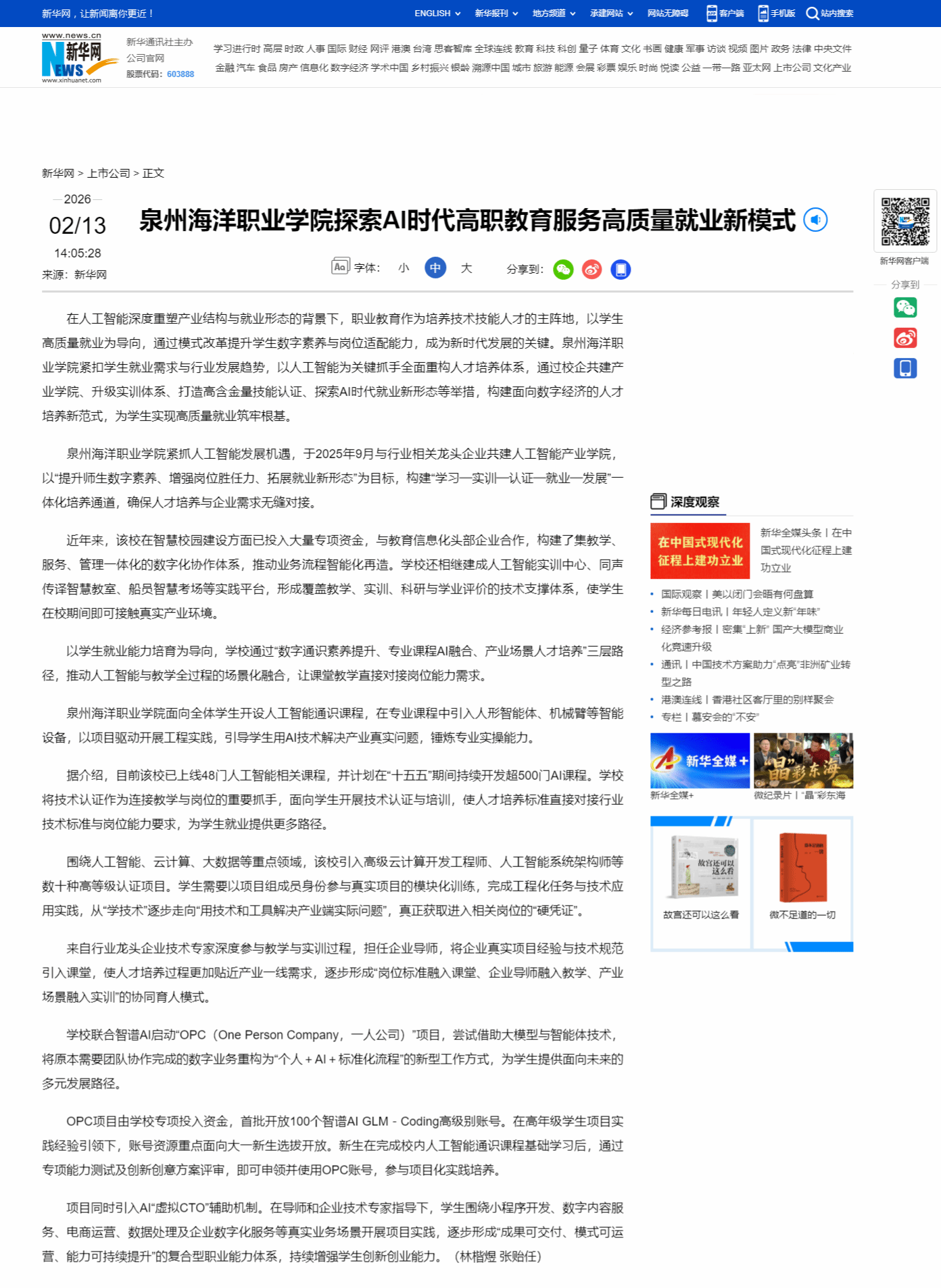 【新华网】泉州海洋职业学院探索AI时代高职教育服务高质量就业新模式