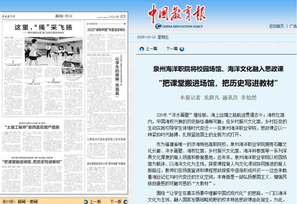 【中国教育报】泉州海洋职院将校园场馆、海洋文化融入思政课 “把课堂搬进场馆,把历史写进教材”