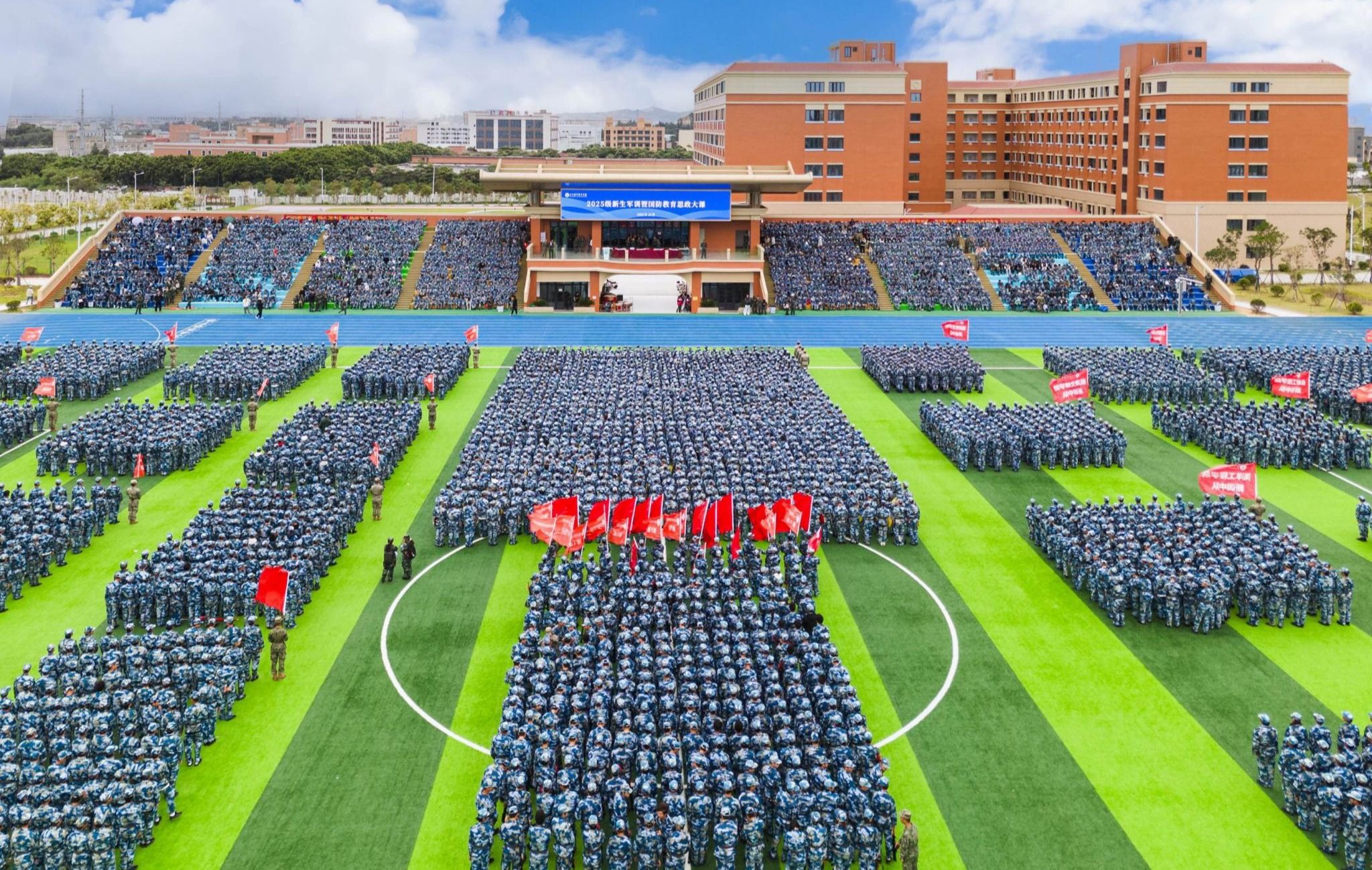 (新闻中心讯 党委学工部供稿 党委宣传部报道)风起霜降,雨落成歌。10月22日上午,泉州海洋职业学院2025级学生军训总结表彰大会在第二运动场(智慧操场)举行。风雨,是考验更是加冕!全体新生士气高昂,以昂扬的斗志、整齐的队列与过硬的风貌,完美呈现了14天军事训练的丰硕成果,为这段蜕变之旅画上了滚烫的句号。石狮市人武部政委鄢夏腾,校长庄伟廉,党委书记黄真真,承训部队领导,常务副校长唐学学,副校长刘锦辉,副校长钱学东,...