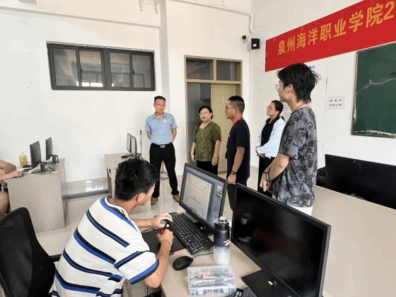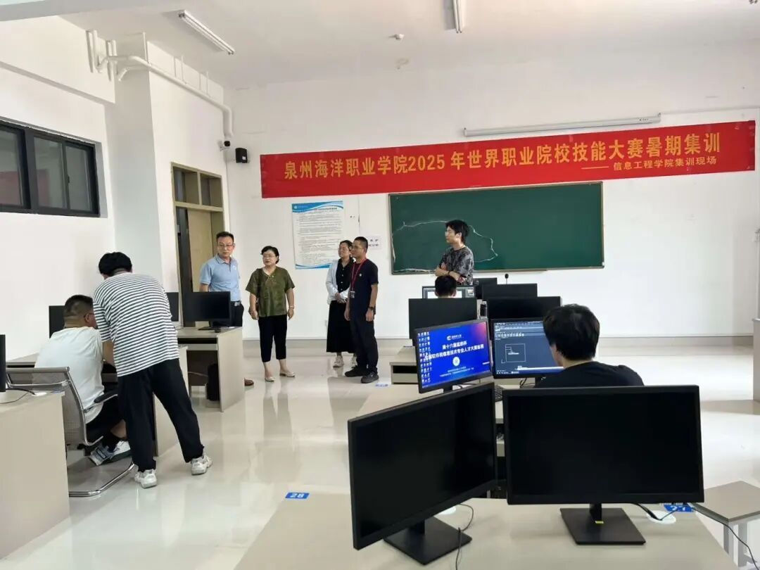 2025年7月7日,泉州海洋职业学院常务副校长唐学学带队前往教学实训楼1410教室看望信息工程学院正在全力备战2025年世界职业院校技能大赛的师生团队。泉州海洋职业学院教务处副处长廖贵强、信息工程学院院长贾超、副院长曹金香相陪同,为参赛师生送去学校的关怀与鼓励。