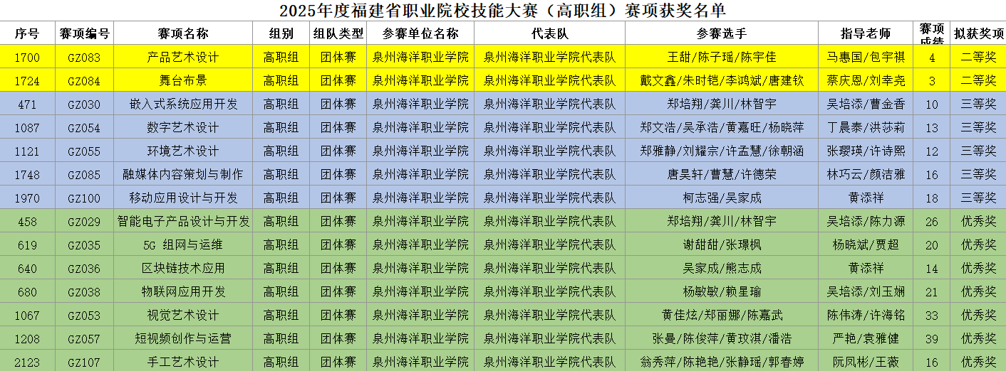 近期,由福建省教育厅等八个部门主办的2025年度福建省职业院校技能大赛高职组落下帷幕。信息工程学院在本届大赛中参与了14个赛项,经过激烈角逐,最终斩获二等奖2项、三等奖5项,优秀奖7项,获奖总数及名次创历史新高。