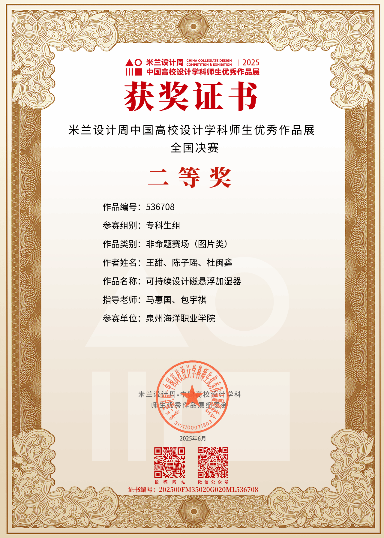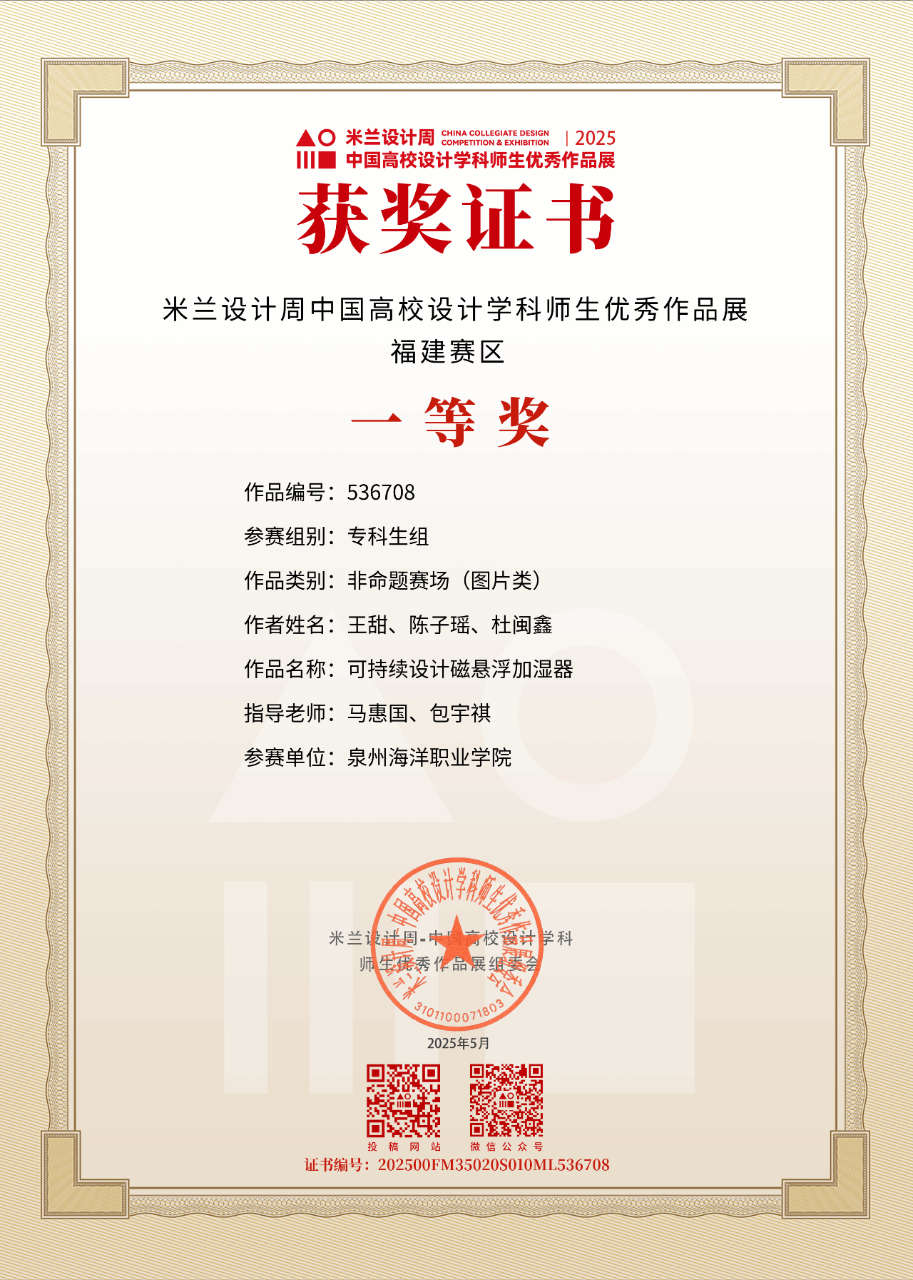 自大赛启动以来,信息工程学院高度重视、精心组织,广泛动员师生参与赛事。学院通过组建专业指导教师团队,对参赛作品进行多轮打磨,最终选出11支优秀团队参加省赛角逐。经过激烈竞争,由陈伟涛、洪莎莉老师指导学生郑丽娜作品《"Spiritual Demon"IP设计》通过视觉符号重构传统文化意象,展现独特的叙事张力,荣获省赛三等奖;由包宇祺、马惠国老师指导学生王甜、陈子瑶、杜闽鑫团队作品《可持续设计磁悬浮加湿器》,以"科技赋能生态"为核心,将磁悬浮技术与可持续理念创新融合荣获省赛一等奖,并作为省赛优秀代表晋级国赛,最终斩获国家级二等奖。
