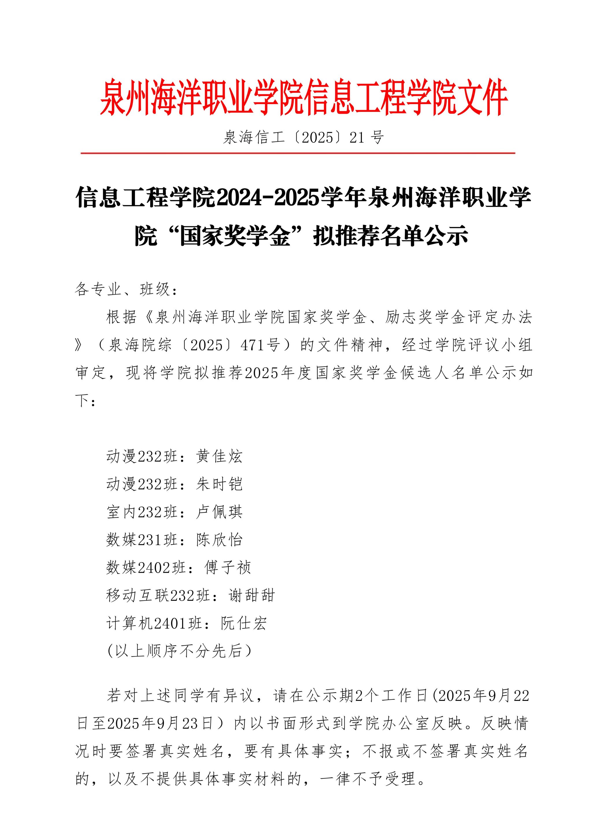 下一篇:信息工程学院2024-2025学年泉州海洋职业学 院“国家励志奖学金”拟推荐名单公示