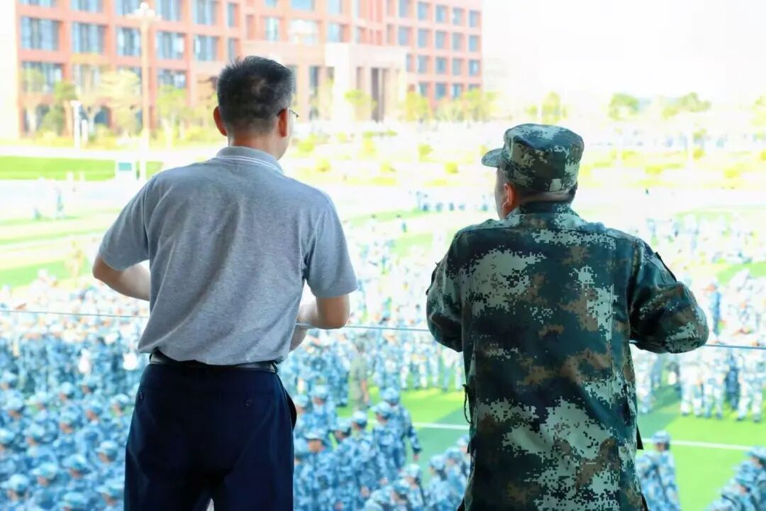 在训练场主席台上,学院领导一行驻足观看学生们的训练情况,对同学们整齐的队列、饱满的精神状态表示赞许。在详细了解训练进度后,领导们与教官、辅导员亲切交流,高度肯定了前者严谨科学的施训方法与后者细致入微的陪伴关怀,并代表学院表达了对大家辛勤付出的衷心感谢。现场气氛温馨融洽,展现了学院上下团结一致、共促军训顺利推进的良好风貌。