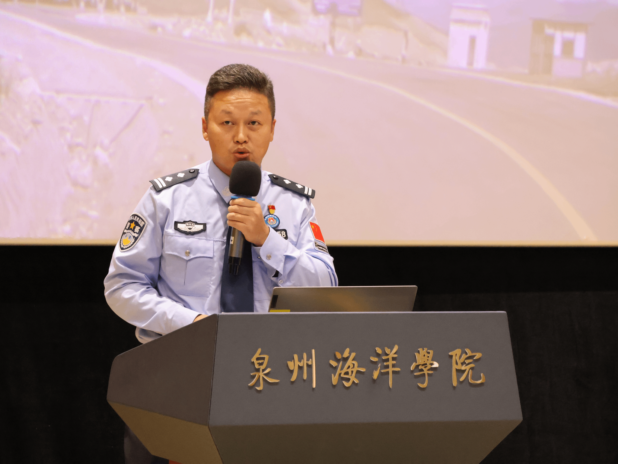 泉州边检站执勤四队副队长洪燕森以《国门之上 山河见证》为题进行演讲。他结合自身多年在边检一线的工作经历,通过鲜活案例、详实数据生动讲述了边检民警在国门防线坚守岗位的日常。