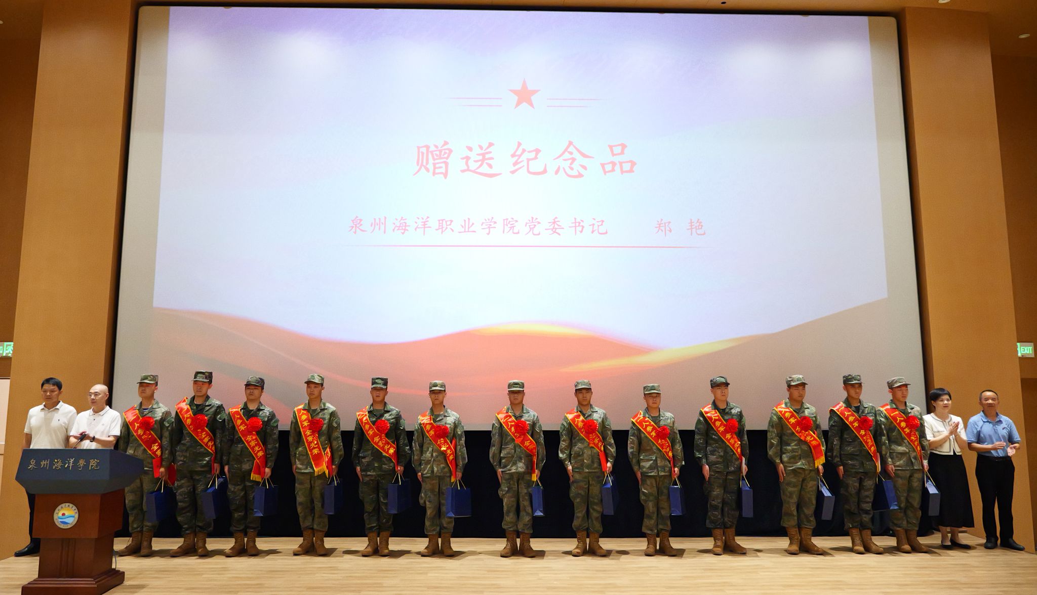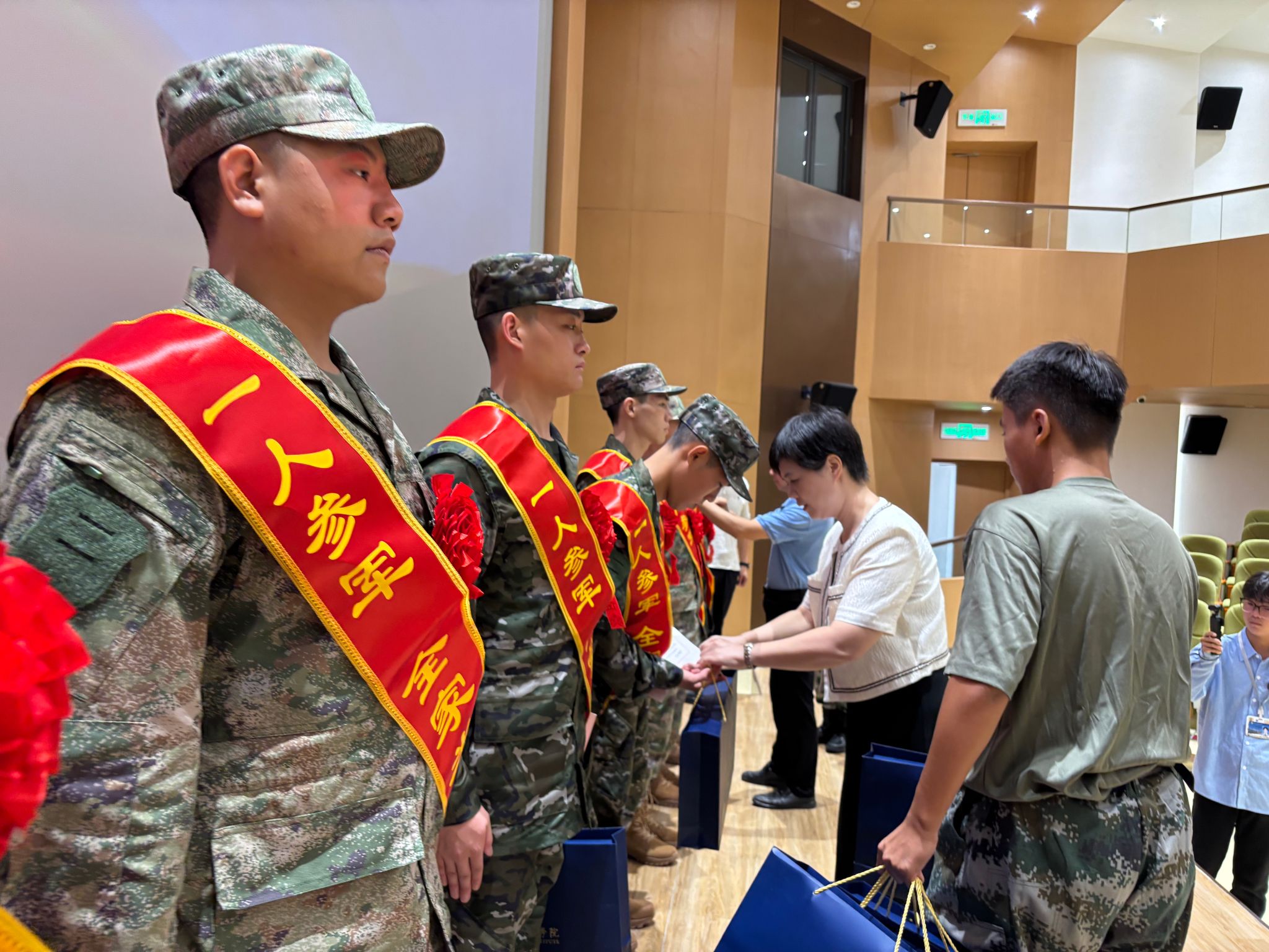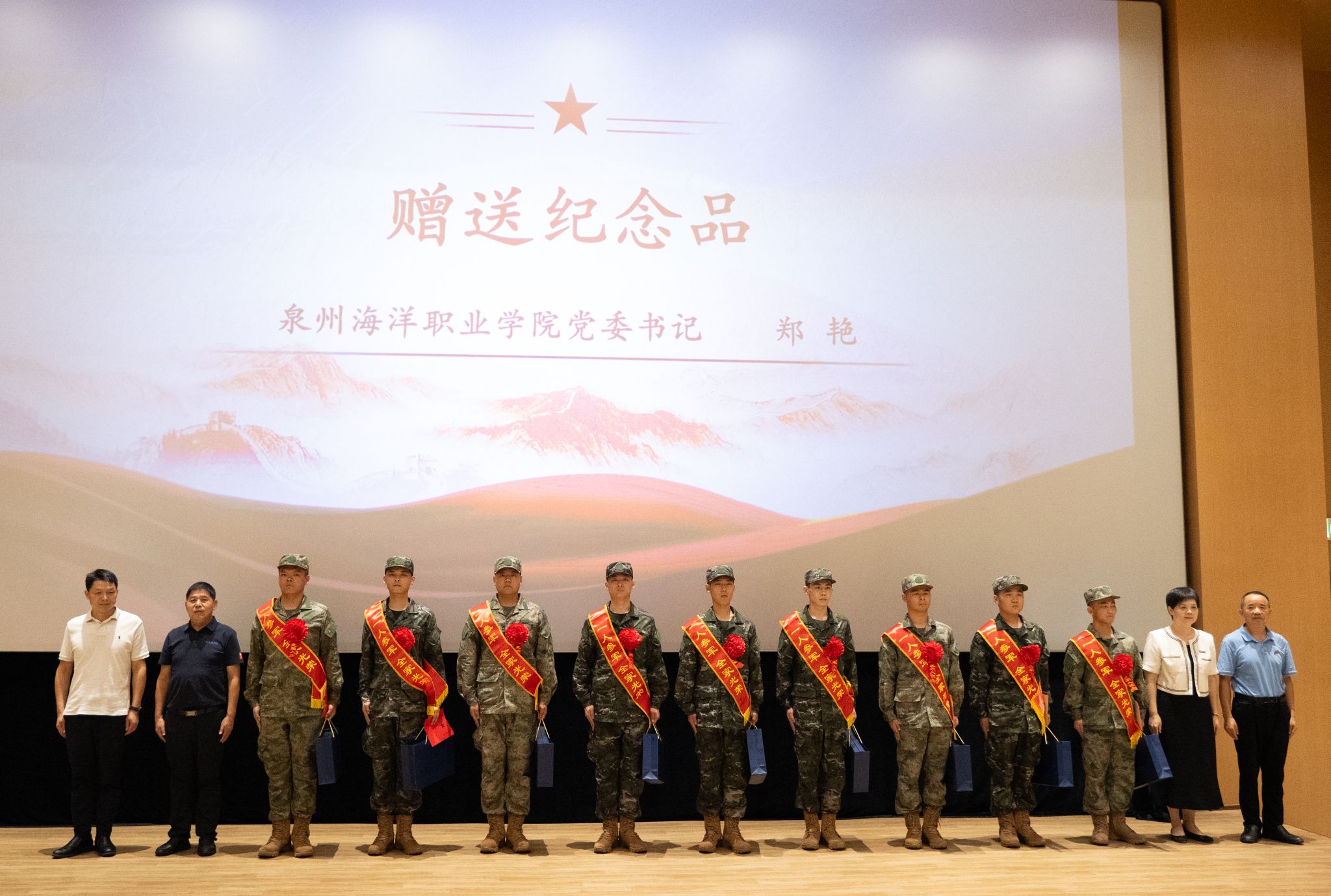 党委书记郑艳向每一位准军人赠送定制纪念品,直招军士代表也向学校回赠礼物,温馨互动凝聚深厚师生情谊。