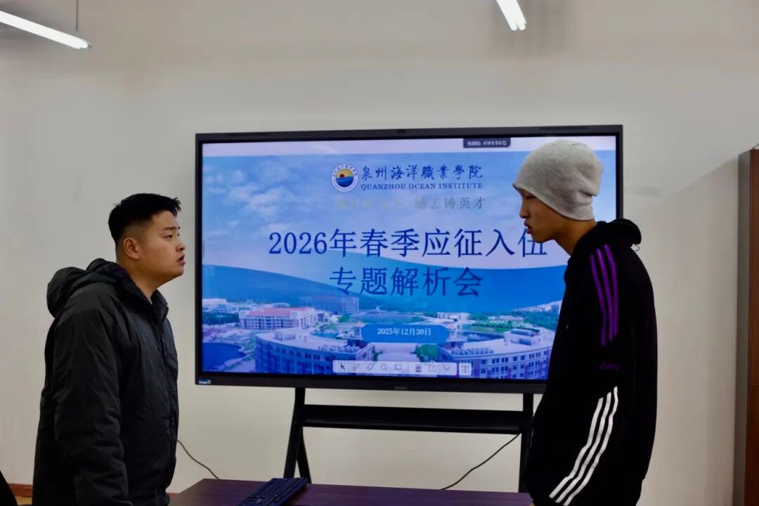 为切实做好2026年春季征兵宣传动员工作,帮助学生精准掌握征兵相关政策,泉州海洋职业学院征兵工作站于2025年12月30日举办应征入伍专题解析会,详细解读春季征兵报名政策、流程及注意事项,助力有志青年投身国防事业。武装部部长苏良城、国防教育学院军事教官黄俊杰出席此次会议。