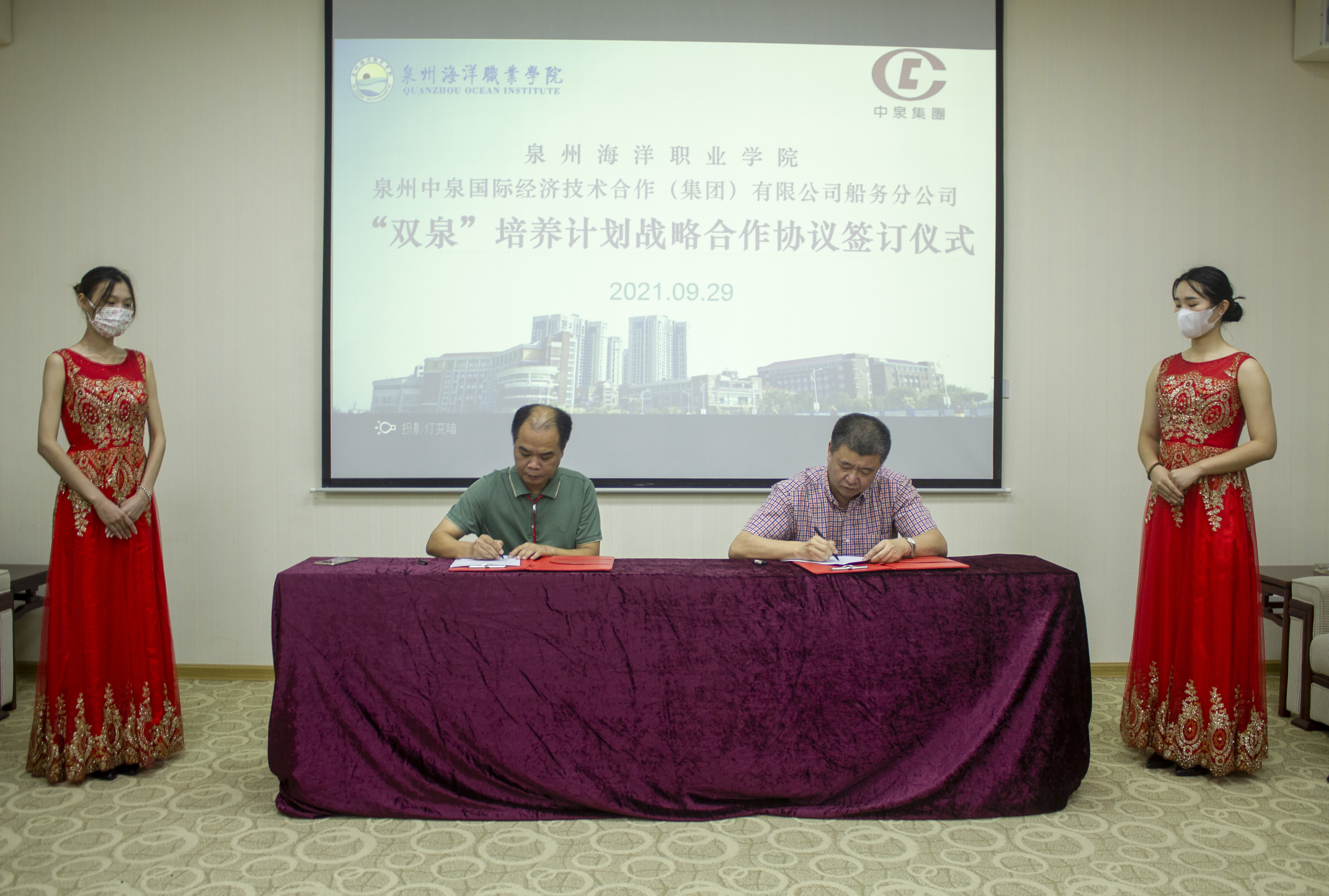 9月29日,双方于我校贵宾接待室签订“双泉”培养计划战略合作协议。中泉集团公司副总兼中泉船务公司总经理陈铭东、中泉集团公司办公室主任苏素文、中泉船务公司副总经理庄文显、施立新;我校董事长蔡天真、副校长刘锦辉、相关二级学院负责人和学生代表出席了签约仪式。