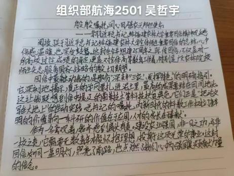 习近平总书记的回信是激励也是指引。作为航海青年学子我们也要以实际行动书写属于我们的时代答卷,为农业强国建设贡献力量。