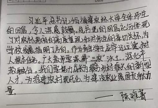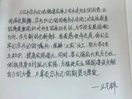 习近平总书记给福建农林大学全体师生的回信,充分体现了对学校的关心与厚爱,为学校发展指明了方向,学校迅速掀起学习热潮,师生们深受鼓舞,表示要牢记嘱托,深耕“三农”。作为学习者,我深感责任重大。今后以回信精神为指引,坚定理想信念,努力学习专业知识,积极投身实践,为推进乡村振兴、建设农业强国贡献自己的力量,像钟梓峰同学一样,把论文写在田野大地上,做新时代强农兴农的排头兵。