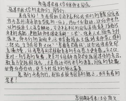 当我得知习近平总书记给你们的重要回信,我作为泉州海洋职业学院的一分子,内心十分激动。这份师生热议的报道令人深受触动。习近平总书记的回信深情肯定了学校25年来的成就,更勉励师生继续深耕“三农”、培养人才,服务乡村振兴。师生们的反响中,汪世华教授和王振婷老师等人提到:“把论文写在田野大地”“厚植爱农情怀”,这些话语朴实却充满力量,让我感受到农林教育者的责任感与使命感。它不仅是对一所学校的鼓舞,更是对全国青年投身农业强国建设的号召。教育与实践相结合,才是推动时代进步的源泉。回信的鼓舞,必将化作行动,续写乡村振兴的鲜活篇章。