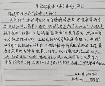 捧读师生们发自肺腑的感言,字句间奔涌着滚烫的热忱,总书记那句“把论文写在祖国大地上”,在郑捷辅导员的“执奋斗之笔谱蔚蓝新章”中激荡回响;张洁同学走进校史馆的脚步,正踏出新时代青年的使命担当。最动人的是那些扎根田垄的身影一林冠烽老师将实验室搬进田野,黄秀泉前辈把育种经验薪火相传。他们用沾满泥土的双手,将“知农爱农”的种子播进年轻心灵。这封回信不仅是肯定,更是燎原的火种,点燃了千千万万农林人躬耕山海,守护仓廪的赤子之心。