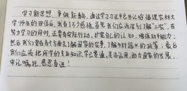 学习新思想,争做新青年。通过学习习近平总书记给福建农林大学师生的回信,我有了不少感悟。首先我们应该深刻了解“三农”,在努力学习的同时,还要有实际行动,拓宽自己的认知,增强动手能力;然后我们要在各个方面去了解国家的实事,了解乡村振兴的政策。最后我们应该把所学的专业知识学以贯通,灵活运用,助力国家的发展,谨记嘱托、感恩奋进!
