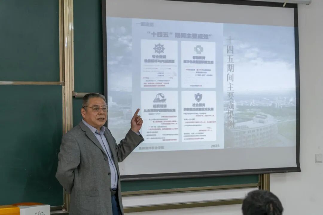 会上,陈景锋带领全体教职工细致逐条学习了学校“十五五”发展规划,深入解读了学校在“十四五”期间取得的成果、当前存在的问题以及“十五五”期间面临的机遇与挑战。通过对比“十三五”末与“十四五”末的关键发展指标,学院进一步明确了自身发展的基础与差距。