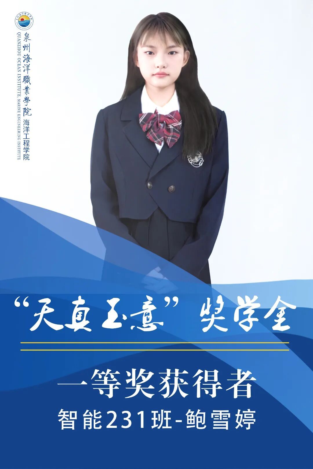 鲍雪婷,女,共青团员,就读于泉州海洋职业学院海洋工程学院23智能控制技术专业。上学年综测专业第1,智育专业第3,获得2024年福建省高职高专组信息素养大赛“一等奖”,2024年泉州海洋职业学院“优秀学生干部”,2025年泉州海洋职业学院“优秀共青团干部”,2025年泉州全民健身运动会第四届高校篮球联赛女子组“季军”。