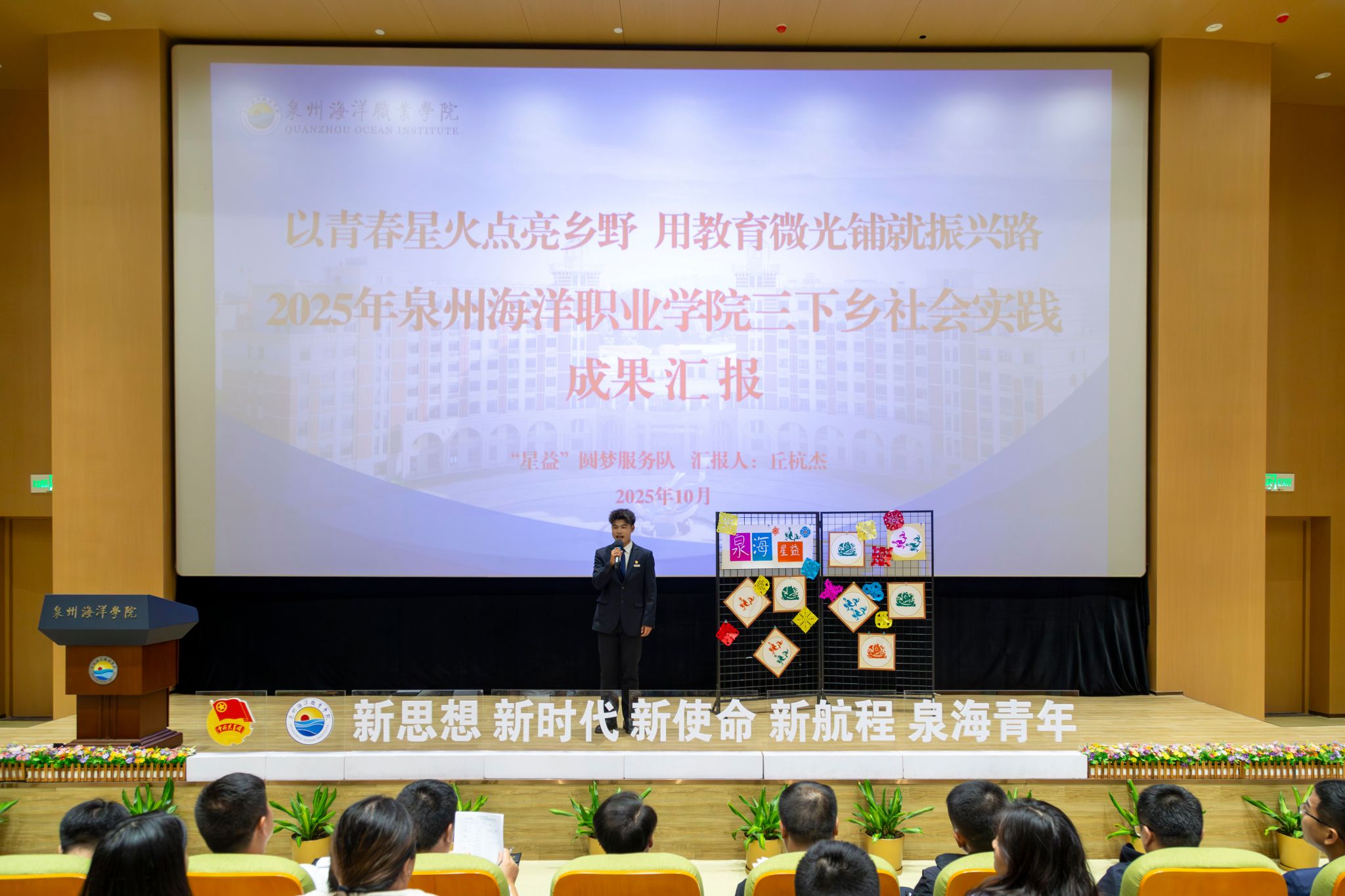 (新闻中心讯 校团委供稿 党委宣传部报道)为引领广大团员青年在社会课堂中受教育、长才干、作贡献,10月30日,泉州海洋职业学院2025年暑期“三下乡”社会实践答辩暨成果展示在图书馆二楼报告厅举行。校党委副书记、副校长李明灿,党委学工部、校团委、各二级学院党总支(直属党支部)、各二级学院团委(团工委)等党团组织负责人、暑期“三下乡”各实践队指导老师及200余名学生代表共同参加活动,见证实践成果。