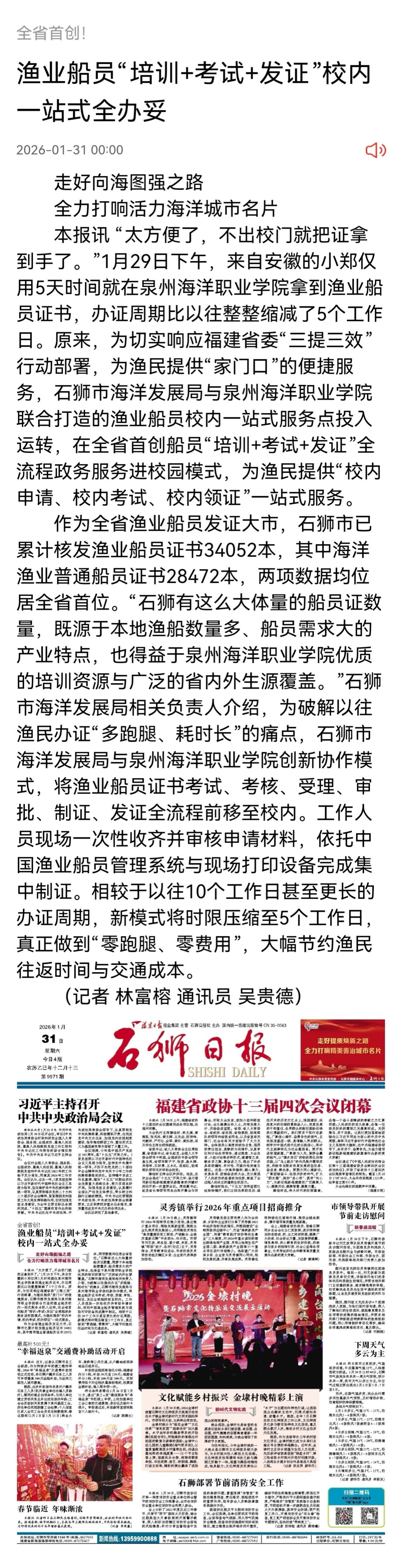 【石狮日报】全省首创!渔业船员“培训+考试+发证”校内一站式全办妥