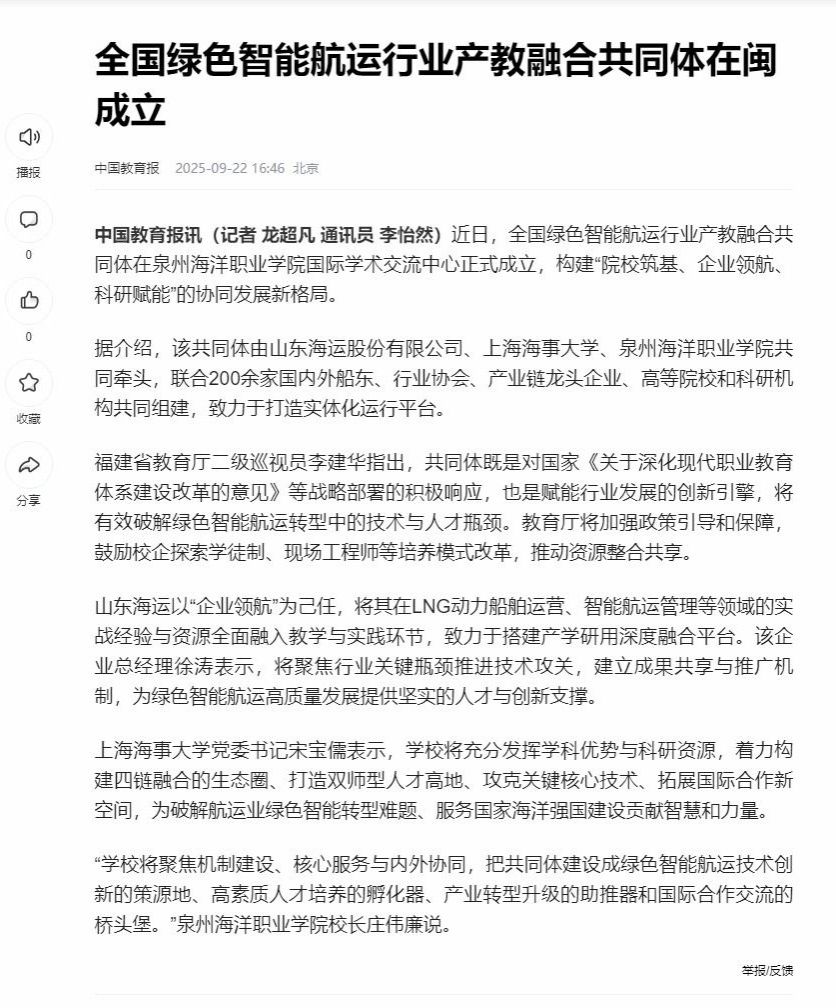 【中国教育报新闻网】全国绿色智能航运行业产教融合共同体在闽成立