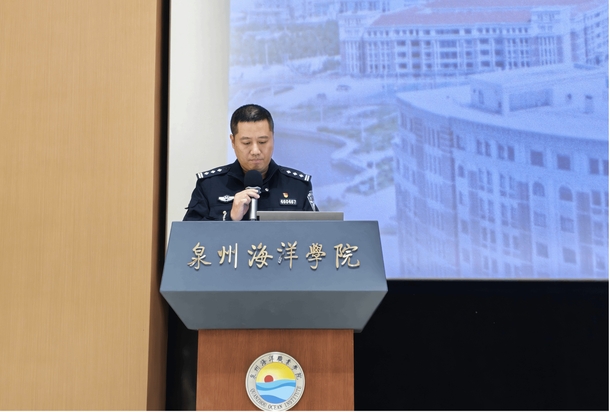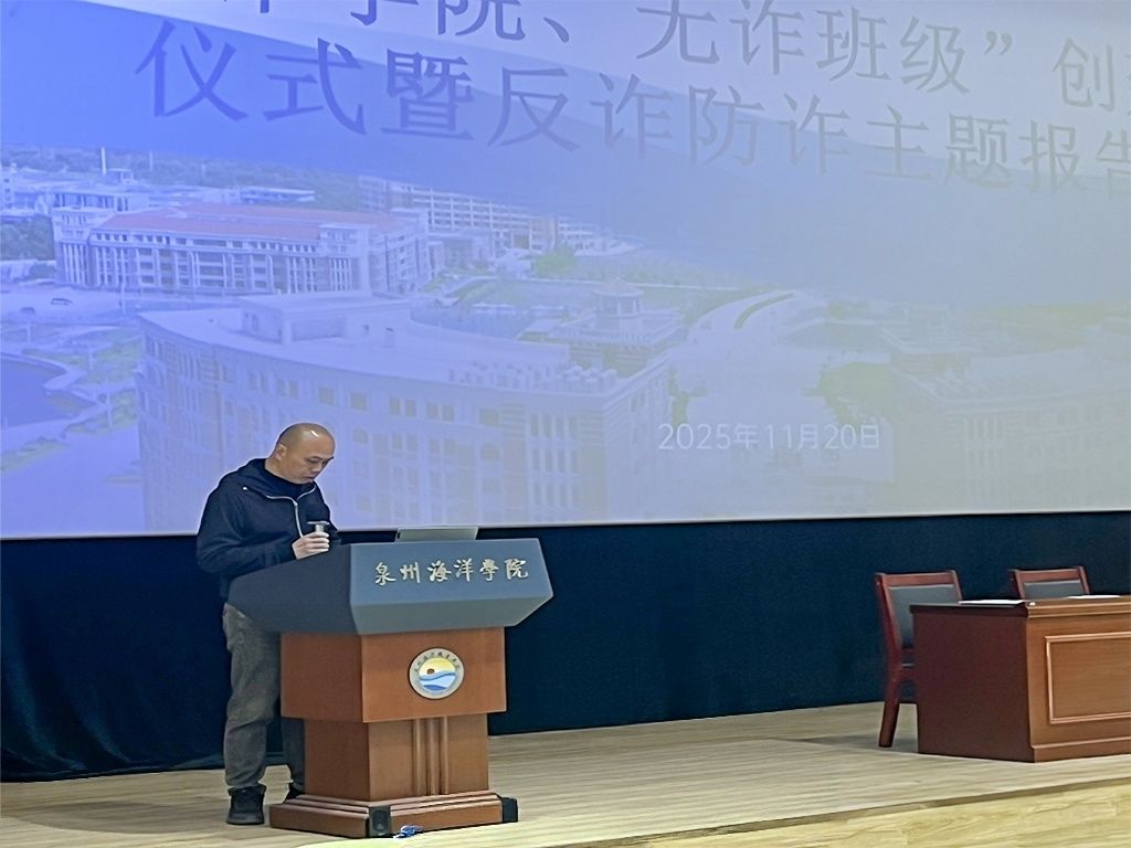 (新闻中心讯 党委保卫部供稿 党委宣传部报道)为切实增强师生防诈骗意识,筑牢校园反诈防线,近日,泉州海洋职业学院“无诈学院、无诈班级”创建启动仪式暨反诈防诈主题报告会在校图书馆二楼报告厅举行。副校长、党委副书记李明灿,祥芝派出所教导员曾国同,驻校民警陈超伟,学工部、保卫部负责人,各二级学院书记,全体辅导员及学生代表共计300余人参加了本次活动。