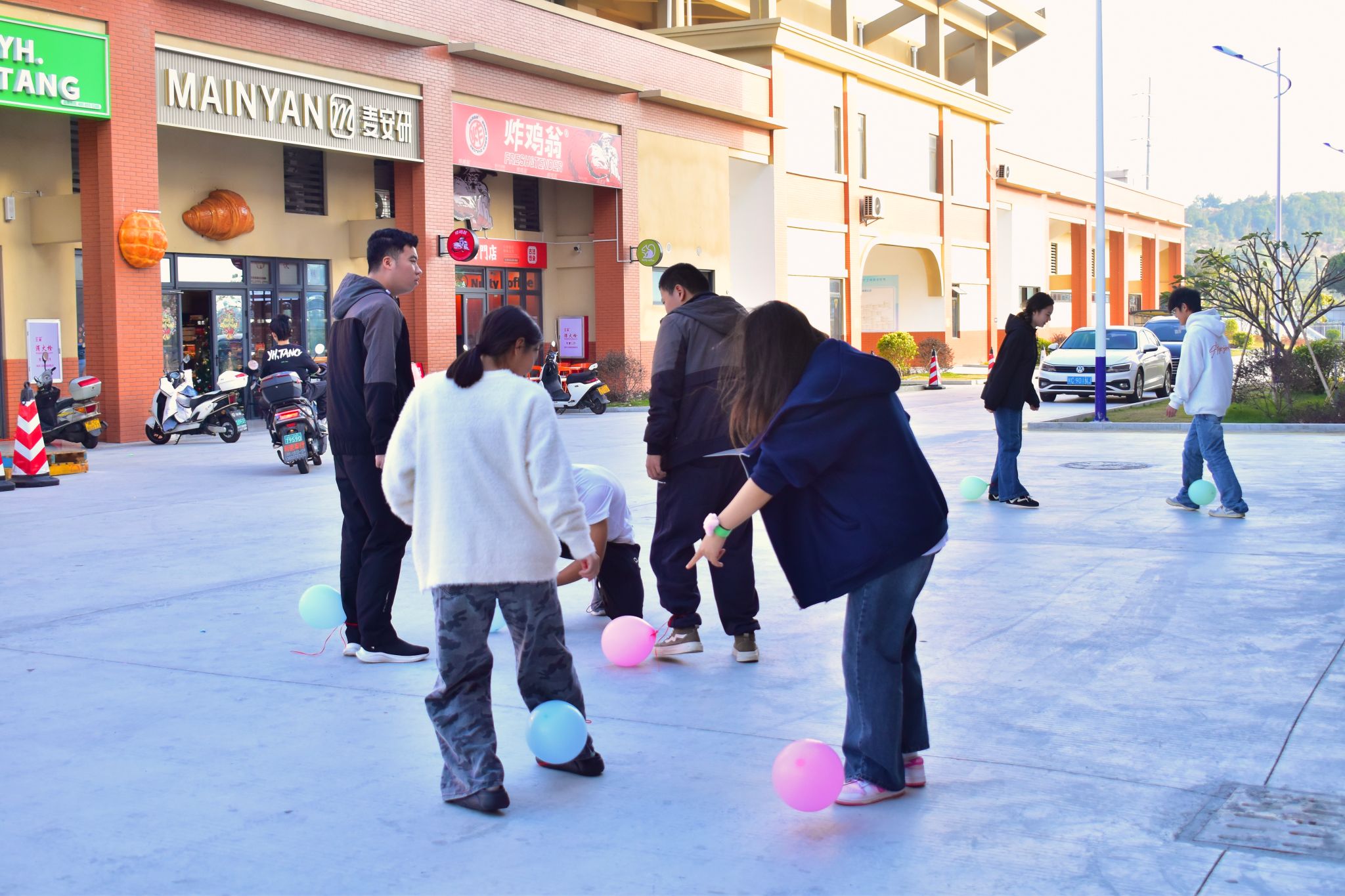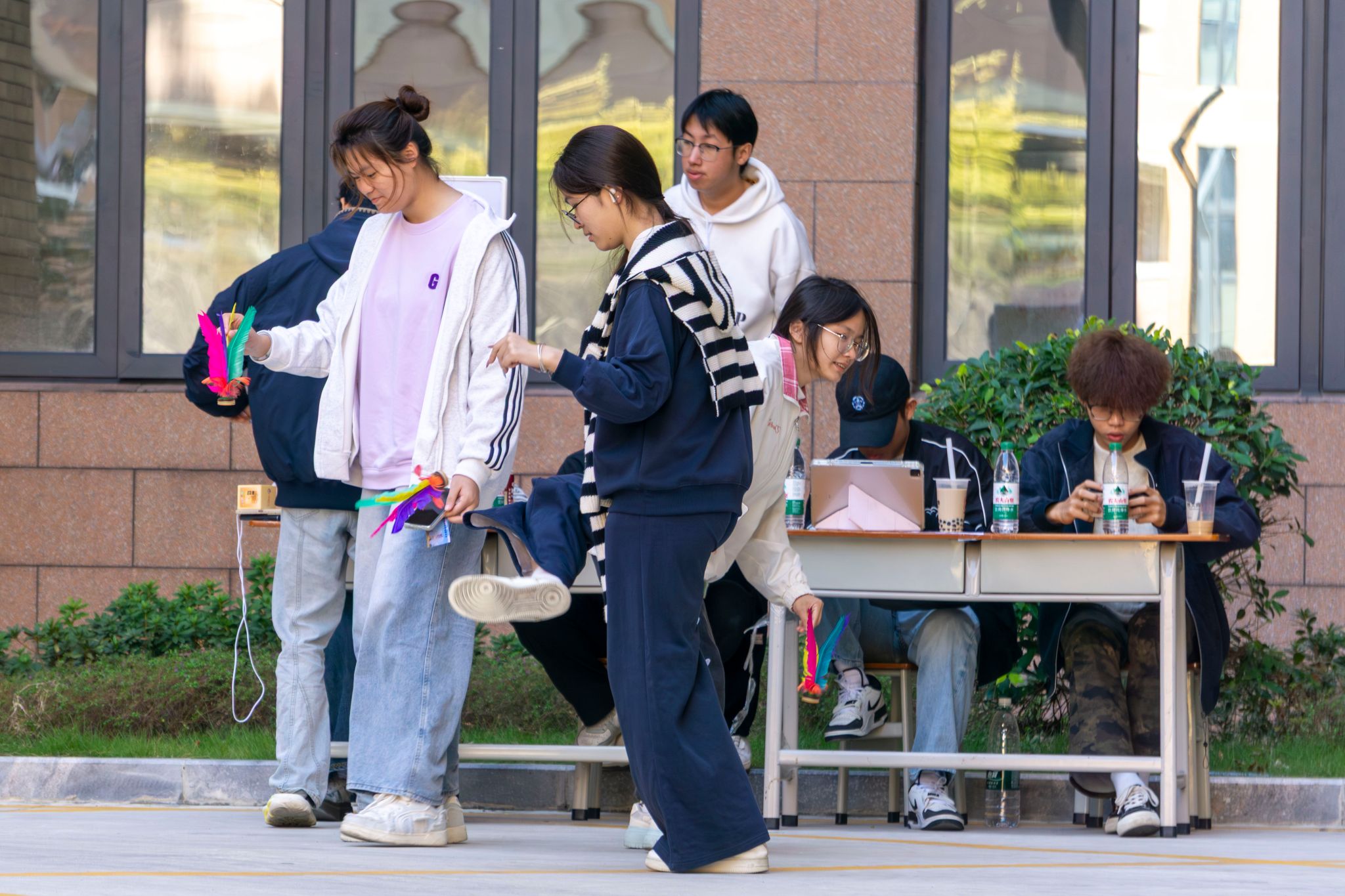 毽子翻飞、气球声响、蹴鞠入门——活力运动区的热情始终高涨。同学们在协作与竞赛中展现朝气,用跃动的身影为这个午后注入了满满的青春能量。尤其在“双足并进·球破天惊”环节中,大家在“踩别人的、护自己的”的博弈中奋勇争先,气球破裂的声响与现场的惊呼、欢笑交织在一起,热闹非凡。