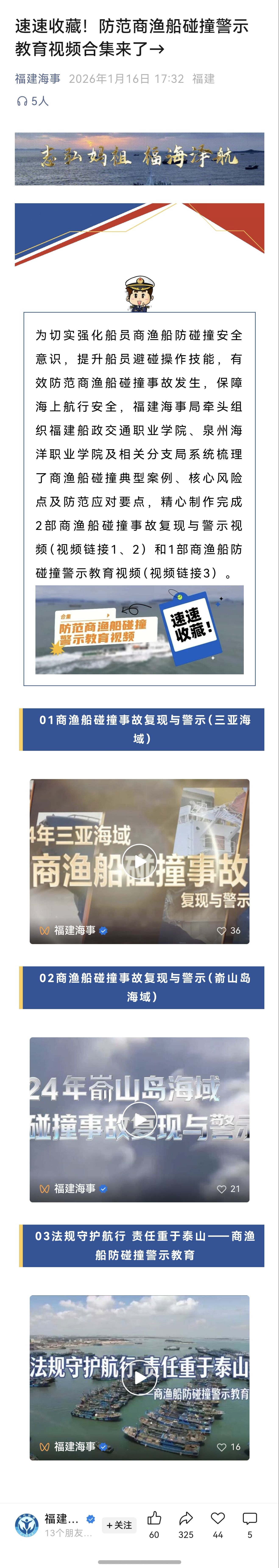 目前,该系列视频已于福建海事局公众微信号正式上线。福建海事局同步下发通知,要求各分支局推动视频纳入航海院校和培训机构的“培训第一课”,鼓励航运企业将其用于船员岗前安全教育,并在海事管理机构、船员服务驿站等场所电子屏滚动播放,进一步扩大警示教育覆盖面。