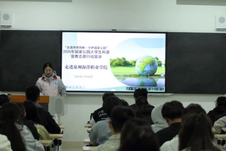 随后,蓝海春潮服务队成员叶思颖以《走进热带雨林,守护国家公园》为主题分享。她依托高清影像,带领师生沉浸式领略雨林风貌,解读其作为“天然空调”“绿色水库”“基因宝库”的核心生态价值,强调其对维系生物多样性的重要意义。她倡议师生践行减塑、少用一次性用品、双面用纸等绿色习惯,以点滴行动守护生态家园。