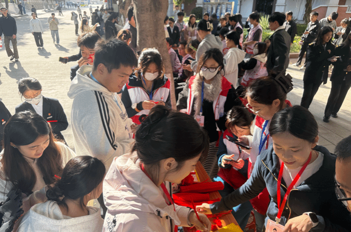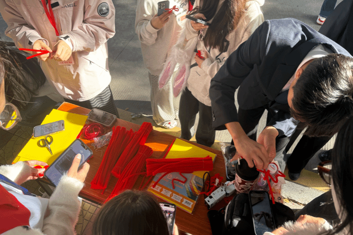 动手创作啦!志愿者们和同学们默契配合,指尖翻飞间,红色扭扭棒渐渐变出各种造型。大家都全神贯注地打磨自己的作品,不一会儿桌上就摆满了各色小挂饰,每一件都带着独一无二的巧思~