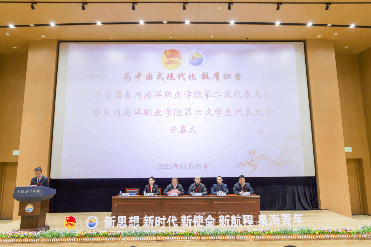 12月5日,共青团泉州海洋职业学院第二次代表大会暨泉州海洋职业学院第六次学生代表大会在我校图书馆报告厅举行。共青团泉州市委员会副书记何培旭,共青团石狮市委员会书记施正极,我校党委书记黄真真,党委副书记、副校长李明灿,闽南理工学院团委书记江鹏飞,泉州纺织服装职业学院团委书记黄晓近,闽南科技学院团委副书记黄俊敏,我校党委学工部、校团委及各二级学院党总支(直属党支部)负责人、团委书记,以及省内外高校20多名团学代表,与团学代会学生代表齐聚一堂,共赴青春盛会。大会开幕式由校团委书记余斐虎主持。