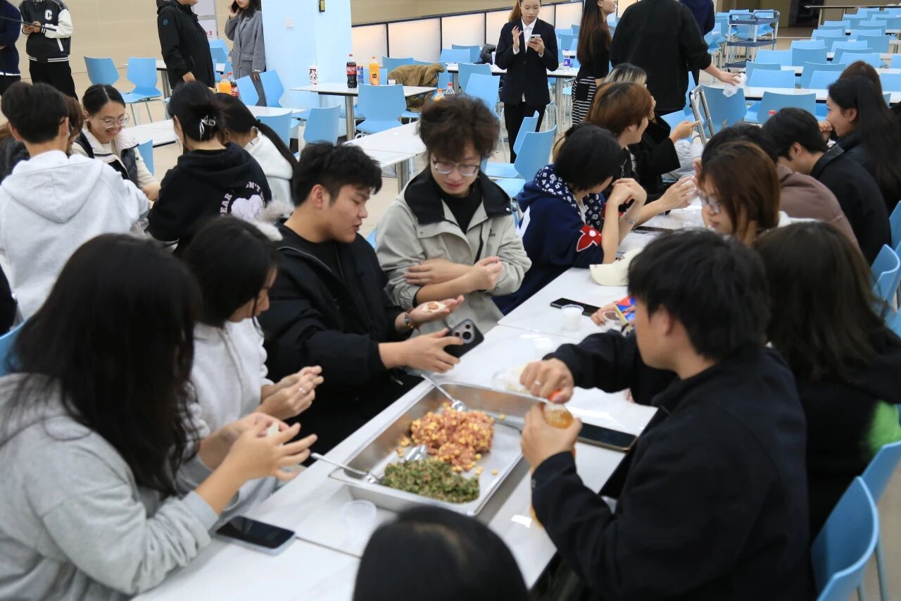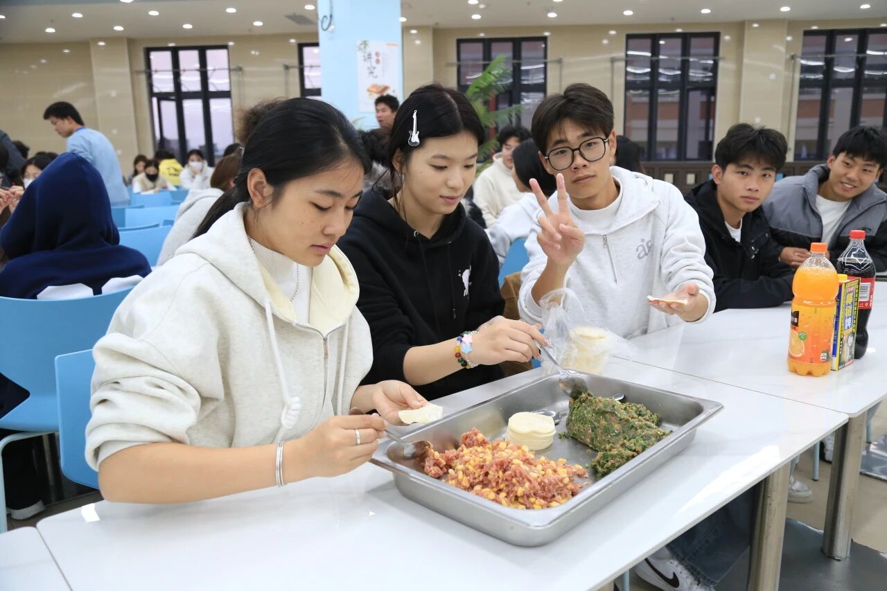 活动伊始,党委学生工作部老师与学生干部们齐聚一堂,共同参与包饺子环节。揉面、擀皮、填馅、捏合,大家分工明确、配合默契,一双双巧手翻飞,将一张张普通的饺子皮变成形态各异的饺子。老师们耐心细致地传授包饺子的技巧,同学们虚心学习、互帮互助,现场欢声笑语不断,每一个饱满的饺子都承载着师生同心的温暖与祝福。